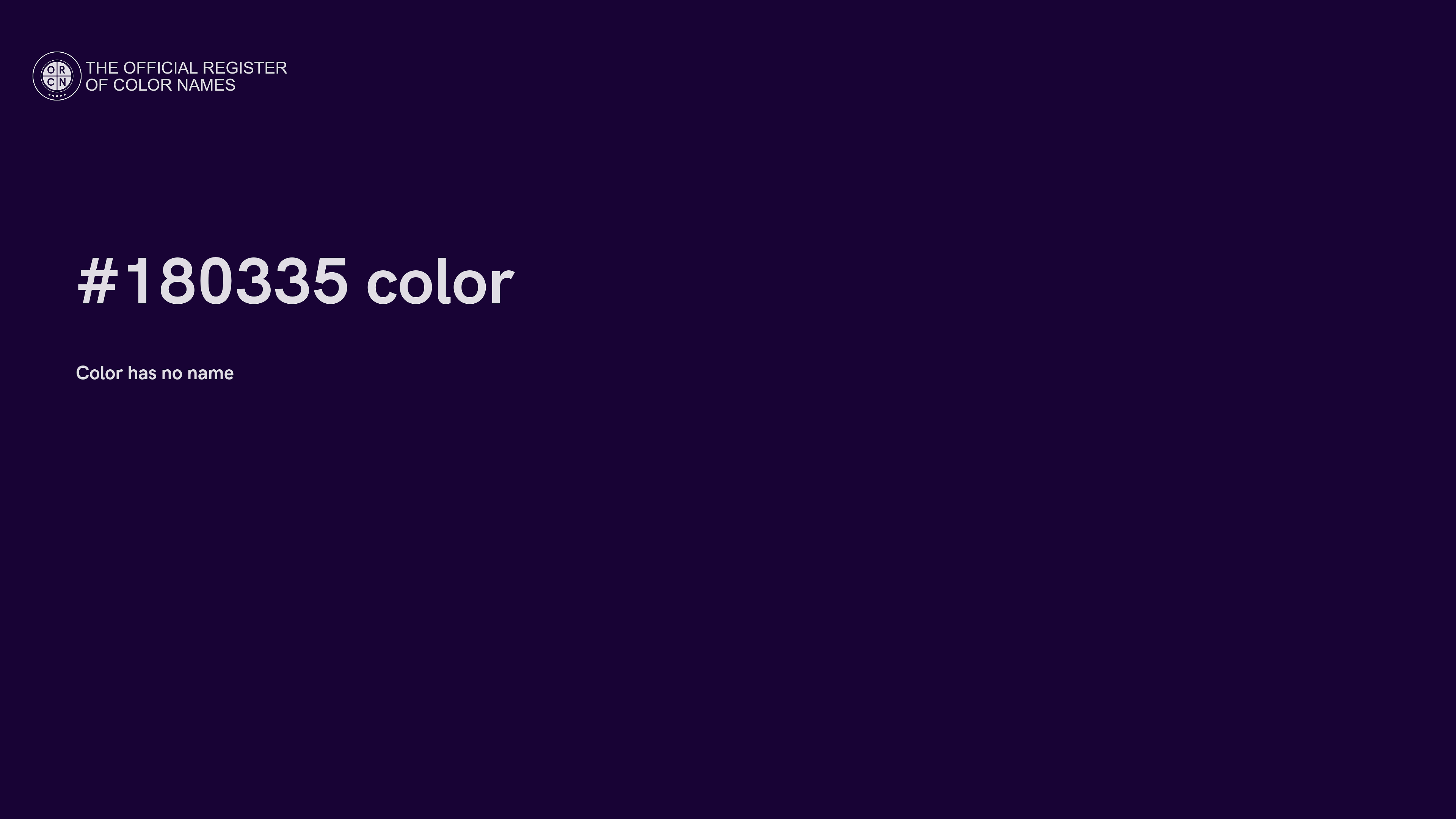 The digital color HEX #180335 belongs to the Violet Color Family featuring Full Saturation (Saturation Family) and Dark (Brightness Family).