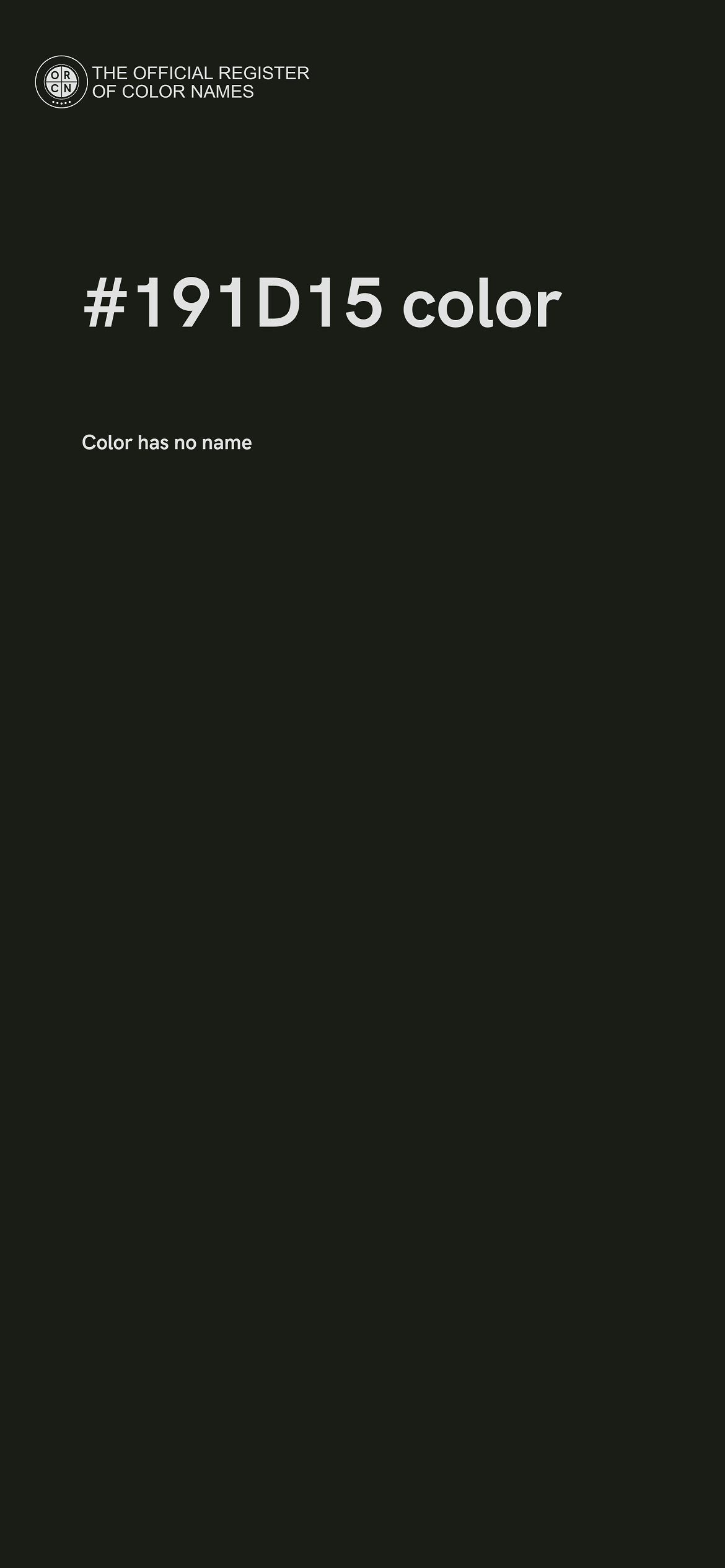 The digital color HEX #191D15 belongs to the Chartreuse Color Family featuring Low Saturation (Saturation Family) and Dark (Brightness Family).