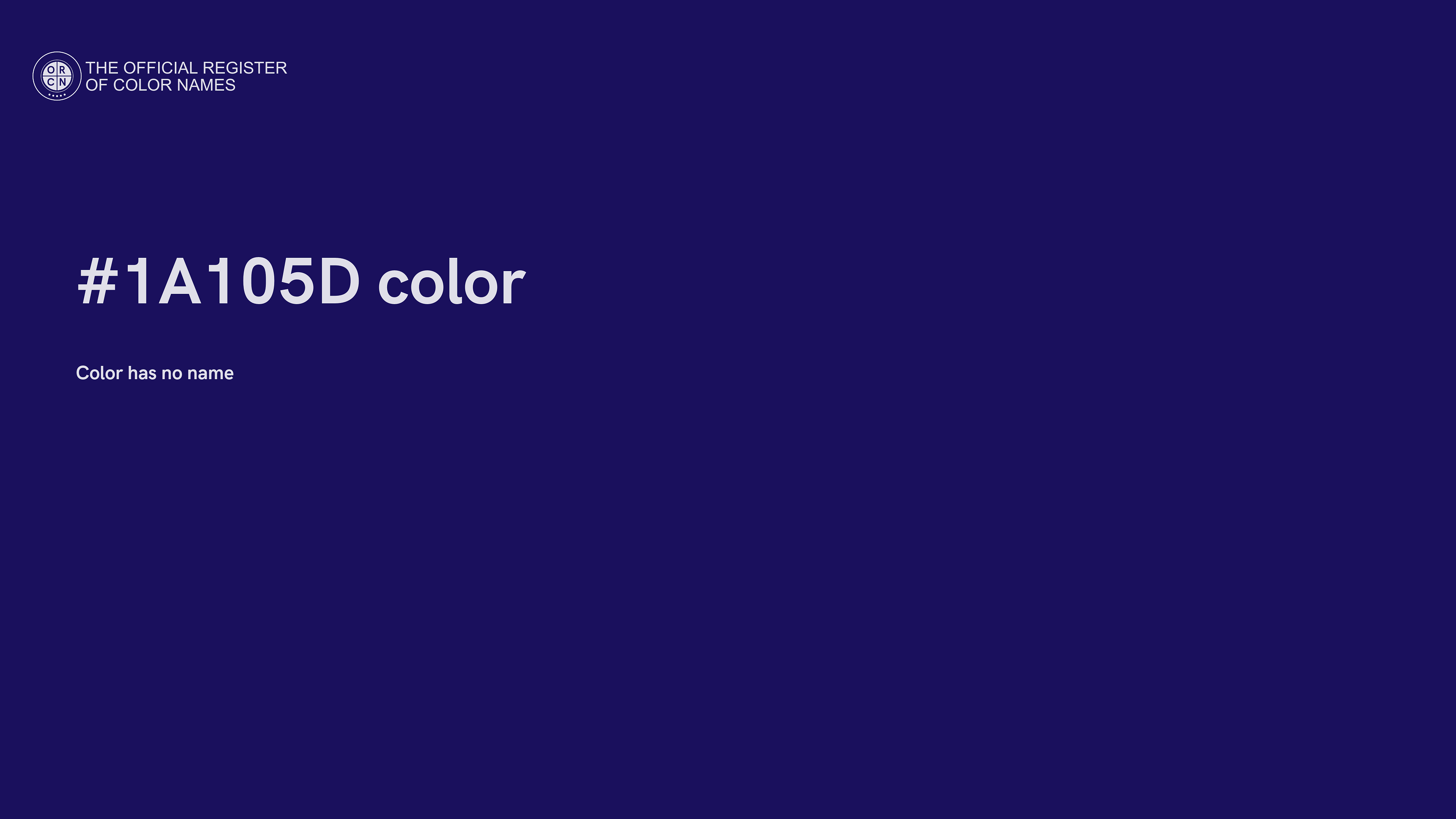 The digital color HEX #1A105D belongs to the Blue Color Family featuring High Saturation (Saturation Family) and Dark (Brightness Family).