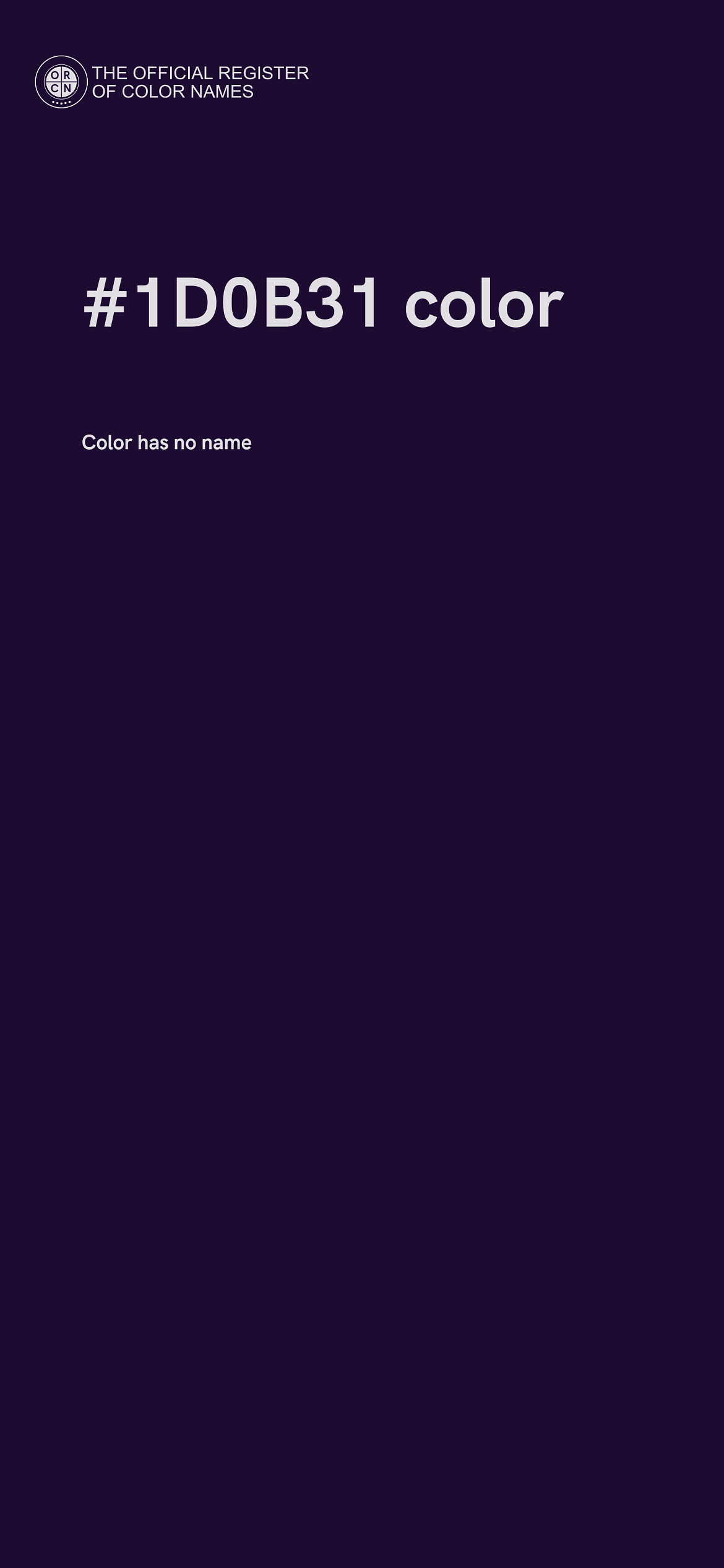 The digital color HEX #1D0B31 belongs to the Violet Color Family featuring High Saturation (Saturation Family) and Dark (Brightness Family).