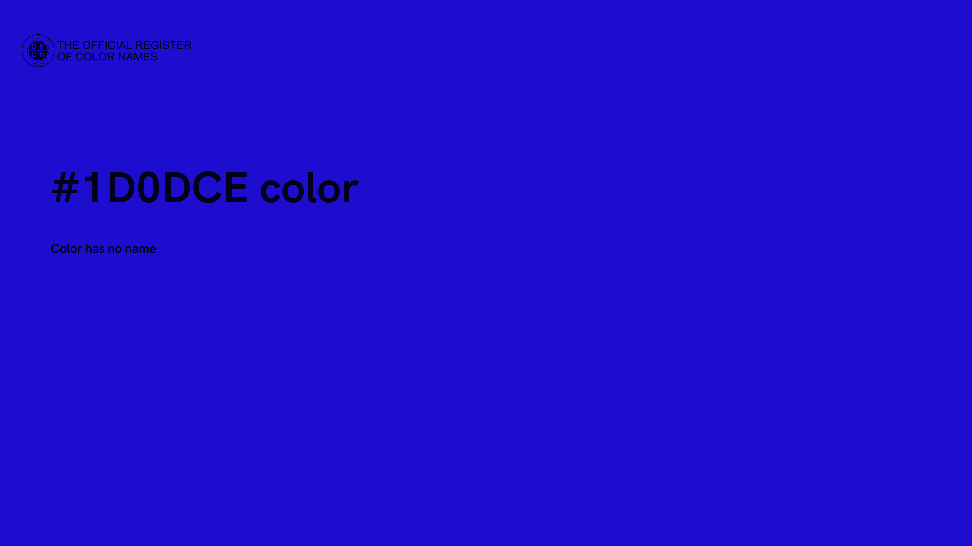 HEX code #1D0DCE represent the color in hexadecimal format by combining three values – the amounts of Red, Green and Blue (RGB). Its RGB composition is 29, 13, 206 ( rgb(29, 13, 206) ), which breaks down into 11.4% of Red, 5.1% Green and 80.8% Blue.