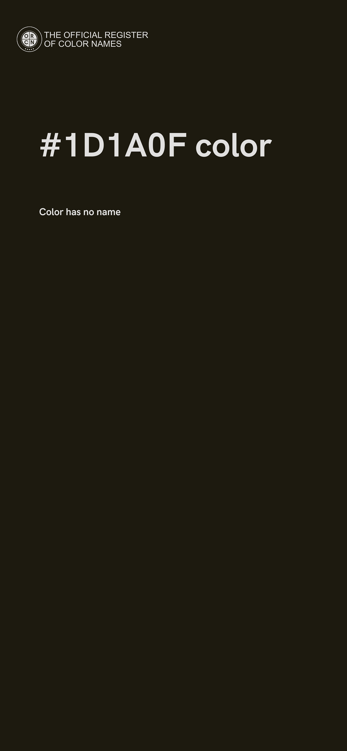 The digital color HEX #1D1A0F belongs to the Yellow Color Family featuring Mild Saturation (Saturation Family) and Very Dark (Brightness Family).