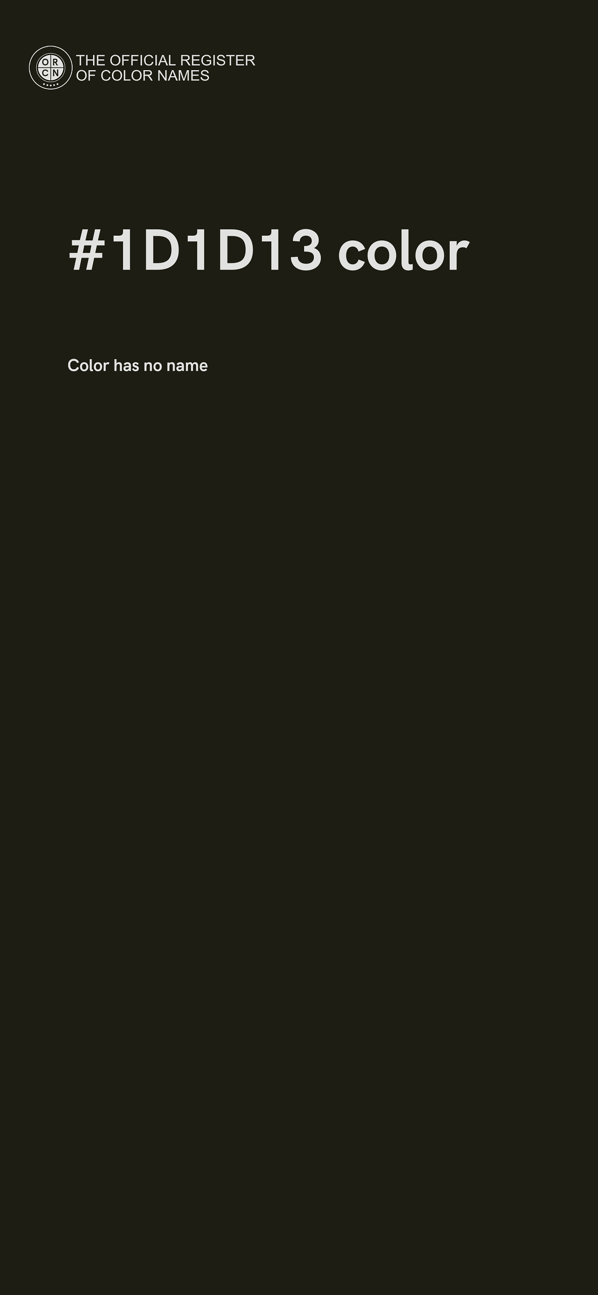 The digital color HEX #1D1D13 belongs to the Yellow Color Family featuring Low Saturation (Saturation Family) and Very Dark (Brightness Family).
