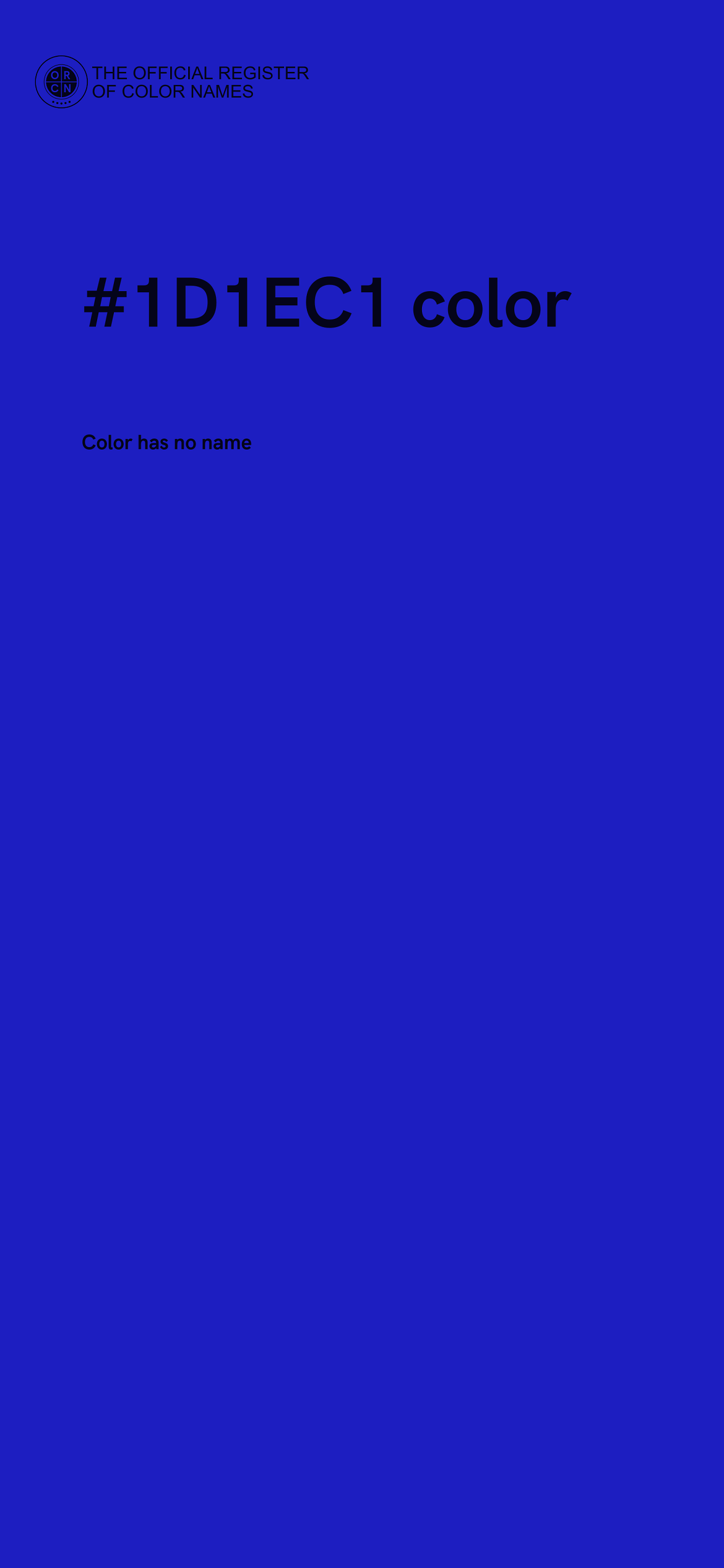The digital color HEX #1D1EC1 belongs to the Blue Color Family featuring High Saturation (Saturation Family) and Light (Brightness Family).
