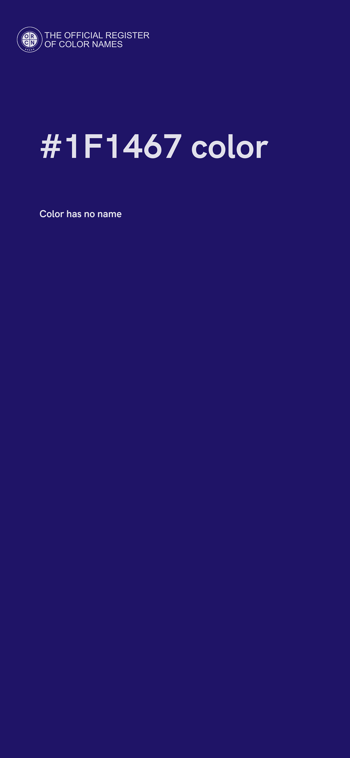 The digital color HEX #1F1467 belongs to the Blue Color Family featuring High Saturation (Saturation Family) and Dark (Brightness Family).
