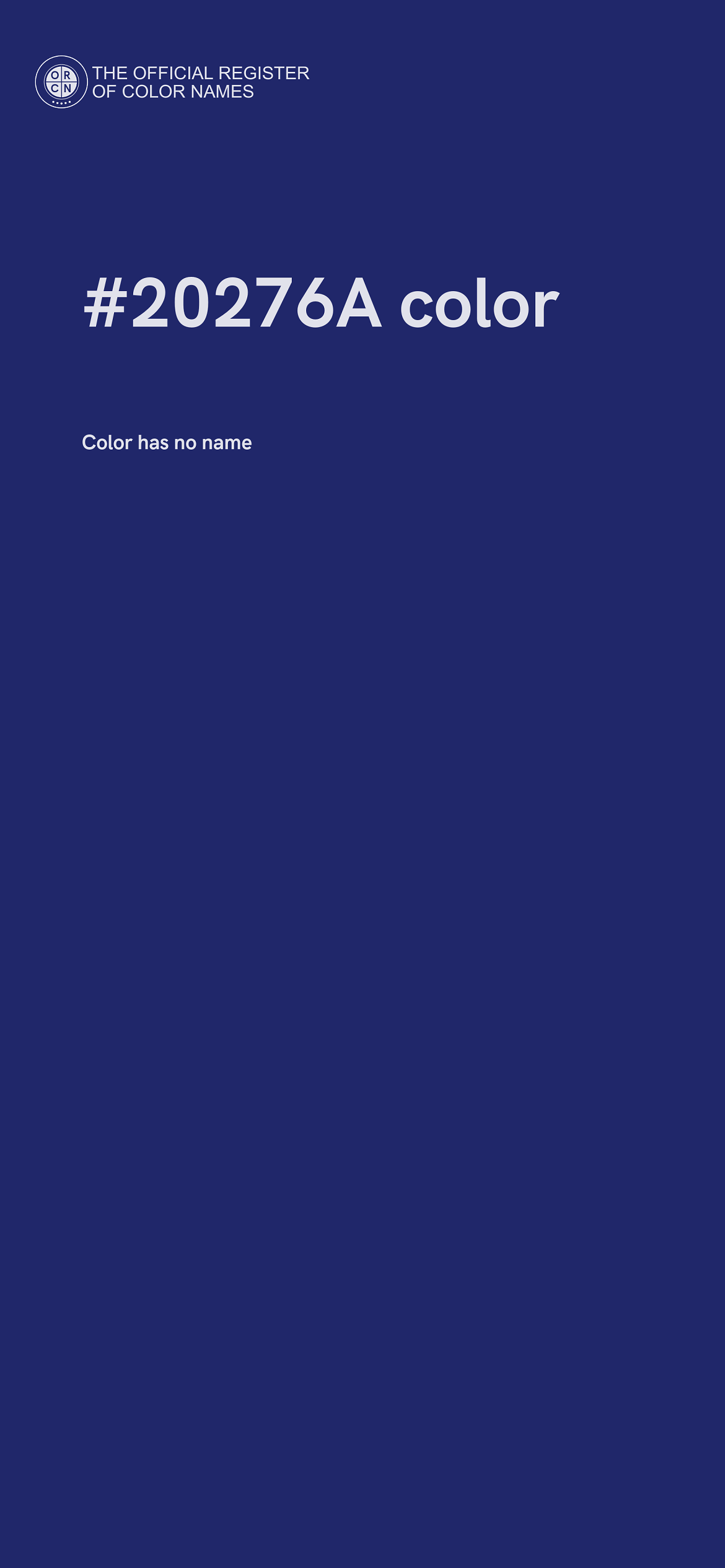 The digital color HEX #20276A belongs to the Blue Color Family featuring Moderate Saturation (Saturation Family) and Neutral (Brightness Family).