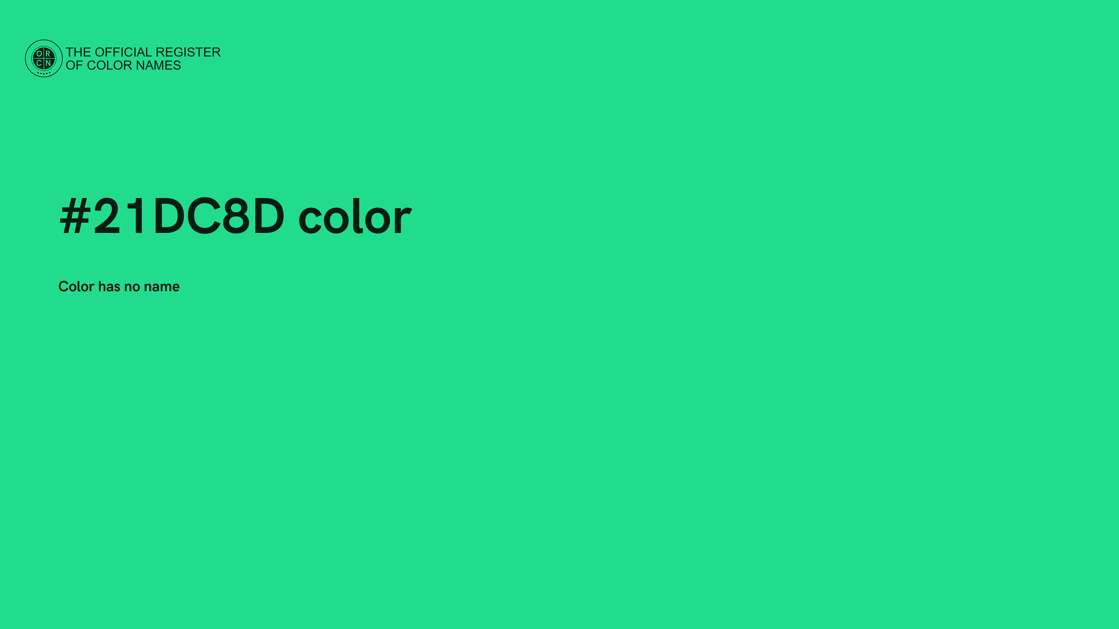 The digital color HEX #21DC8D belongs to the Spring Green Color Family featuring High Saturation (Saturation Family) and Light (Brightness Family).