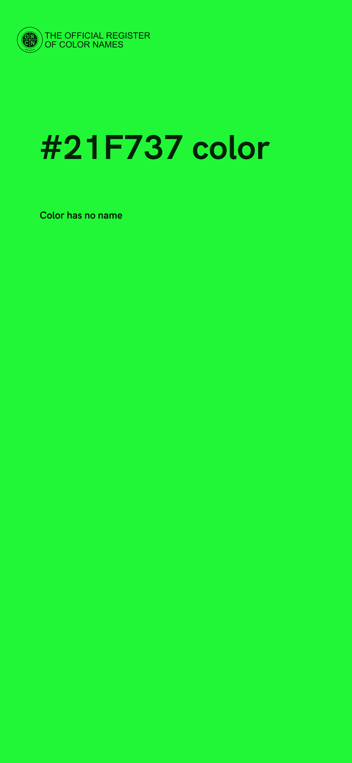 The digital color HEX #21F737 belongs to the Green Color Family featuring Full Saturation (Saturation Family) and Light (Brightness Family).