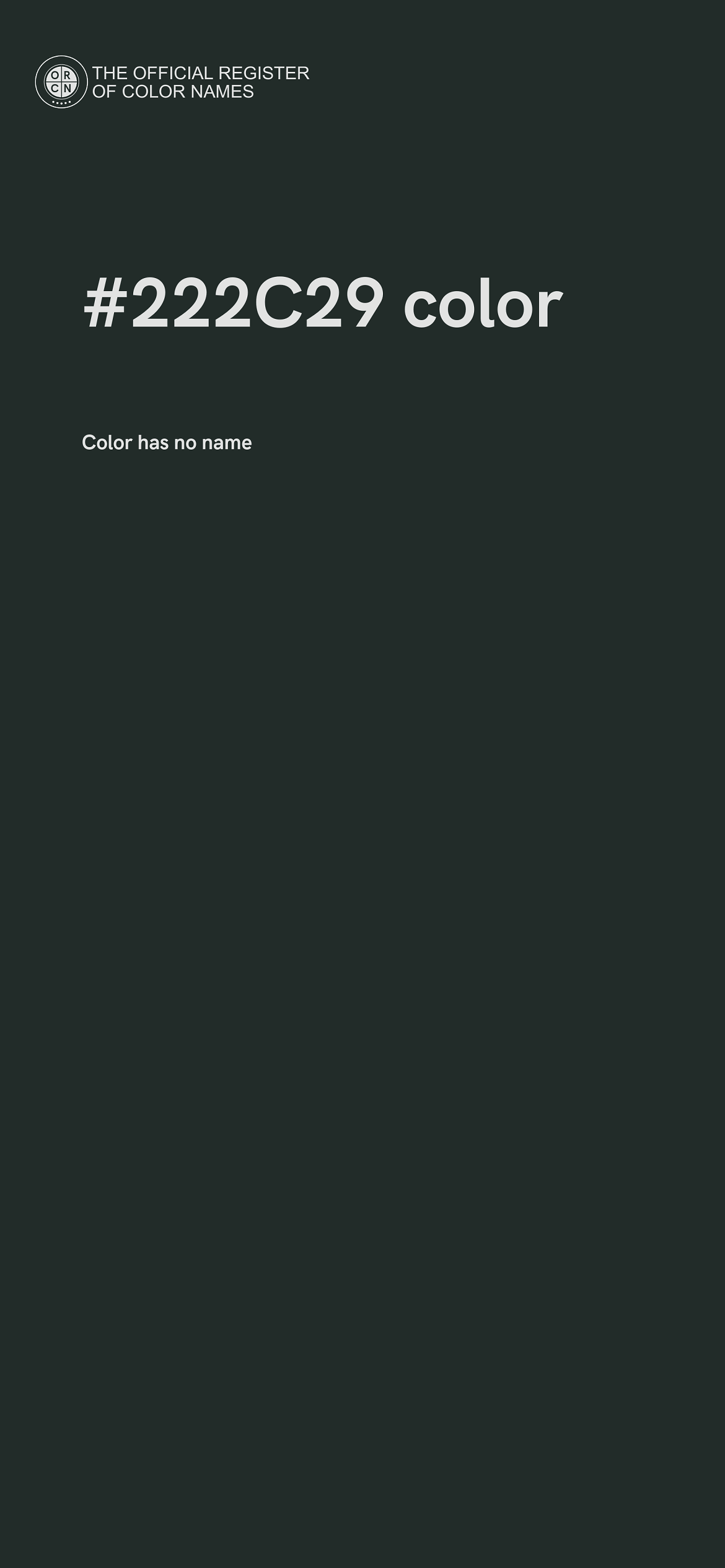 The digital color HEX #222C29 belongs to the Spring Green Color Family featuring Low Saturation (Saturation Family) and Dark (Brightness Family).