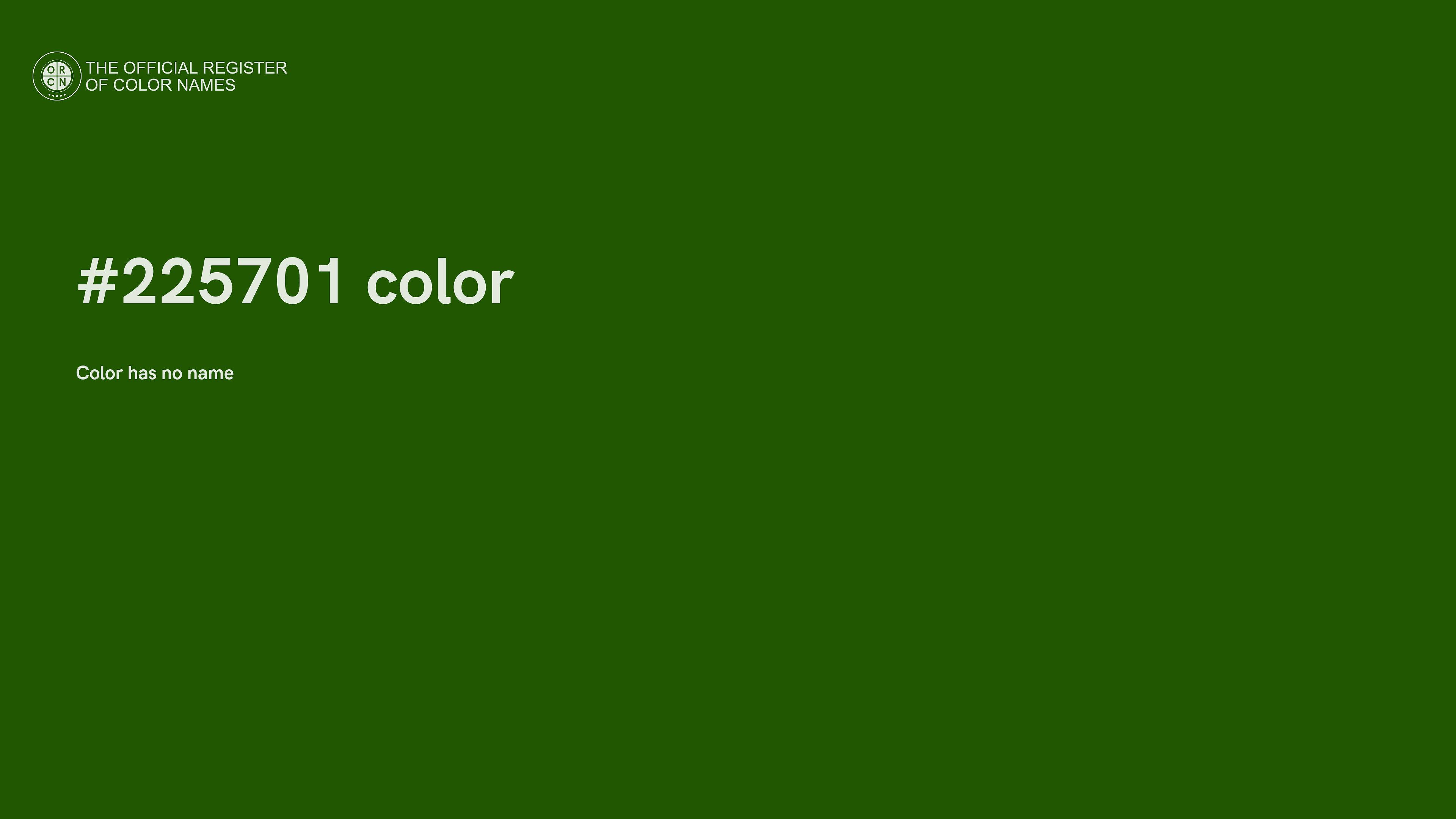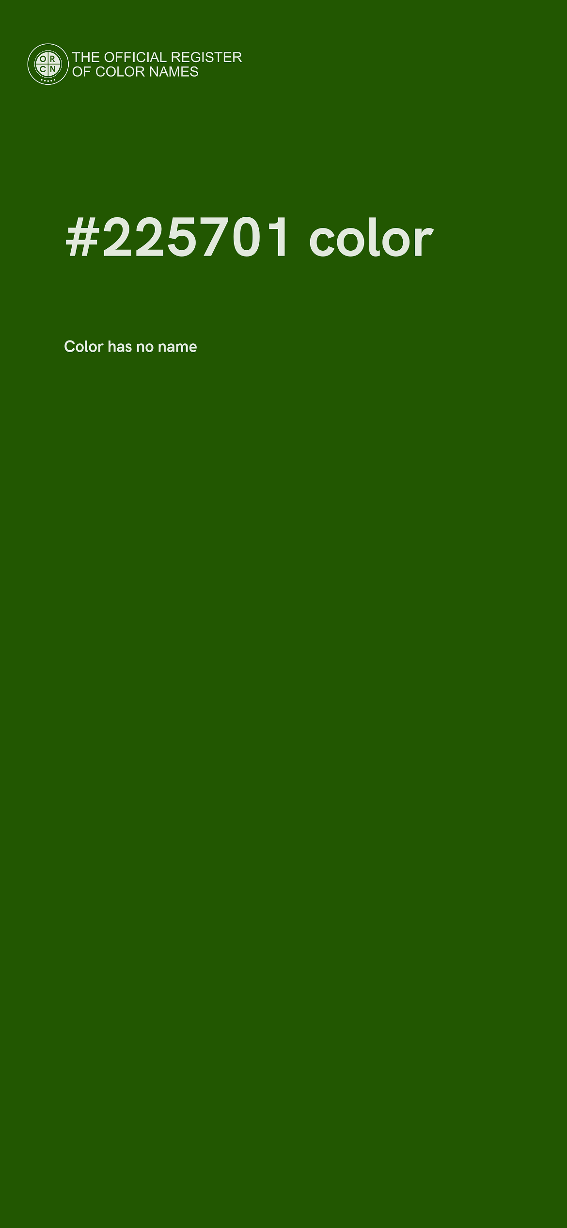 For printing in non digital world, #225701 is represented in CMYK as 21 Cyan, 0 Magenta, 34 Yellow, and 66 Black (Key) (C:21 M:0 Y:34 K:66).