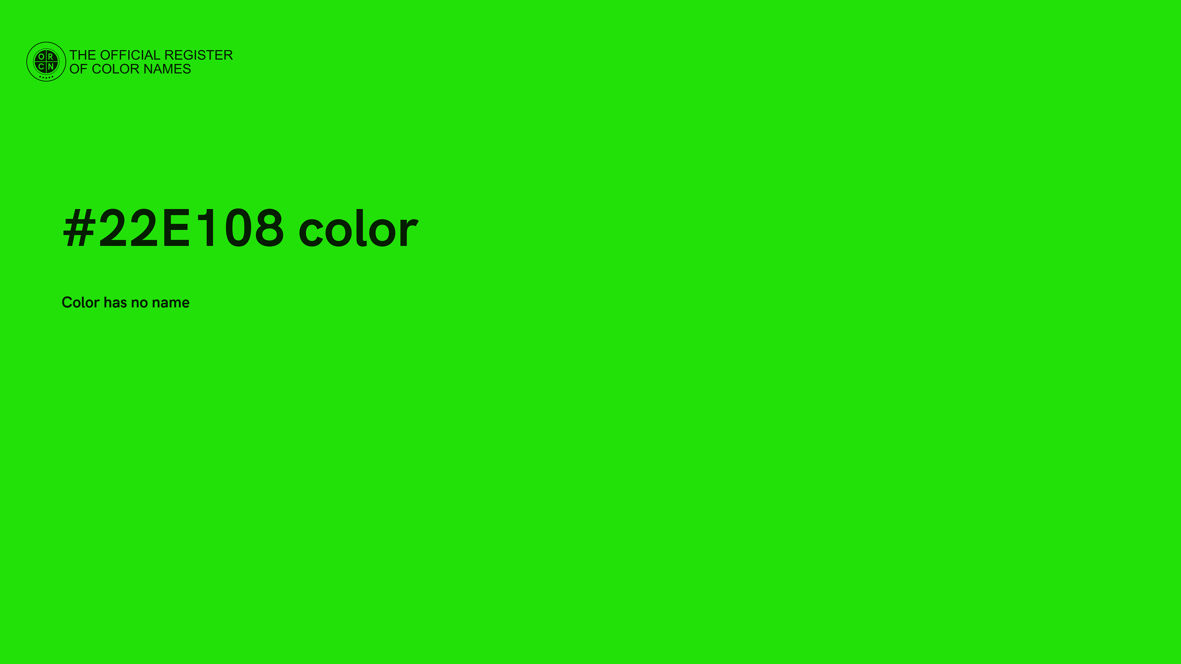 The digital color HEX #22E108 belongs to the Green Color Family featuring Full Saturation (Saturation Family) and Light (Brightness Family).