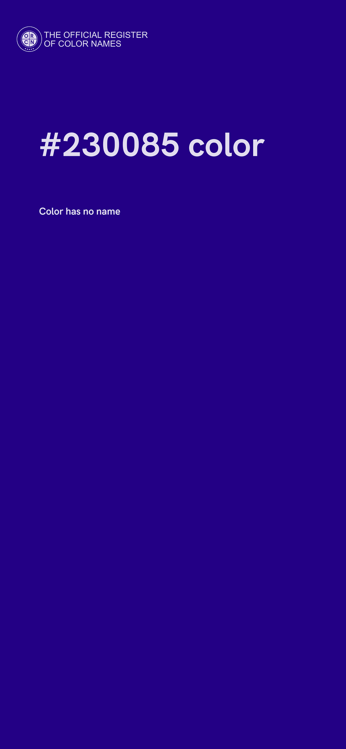 The digital color HEX #230085 belongs to the Violet Color Family featuring Full Saturation (Saturation Family) and Neutral (Brightness Family).