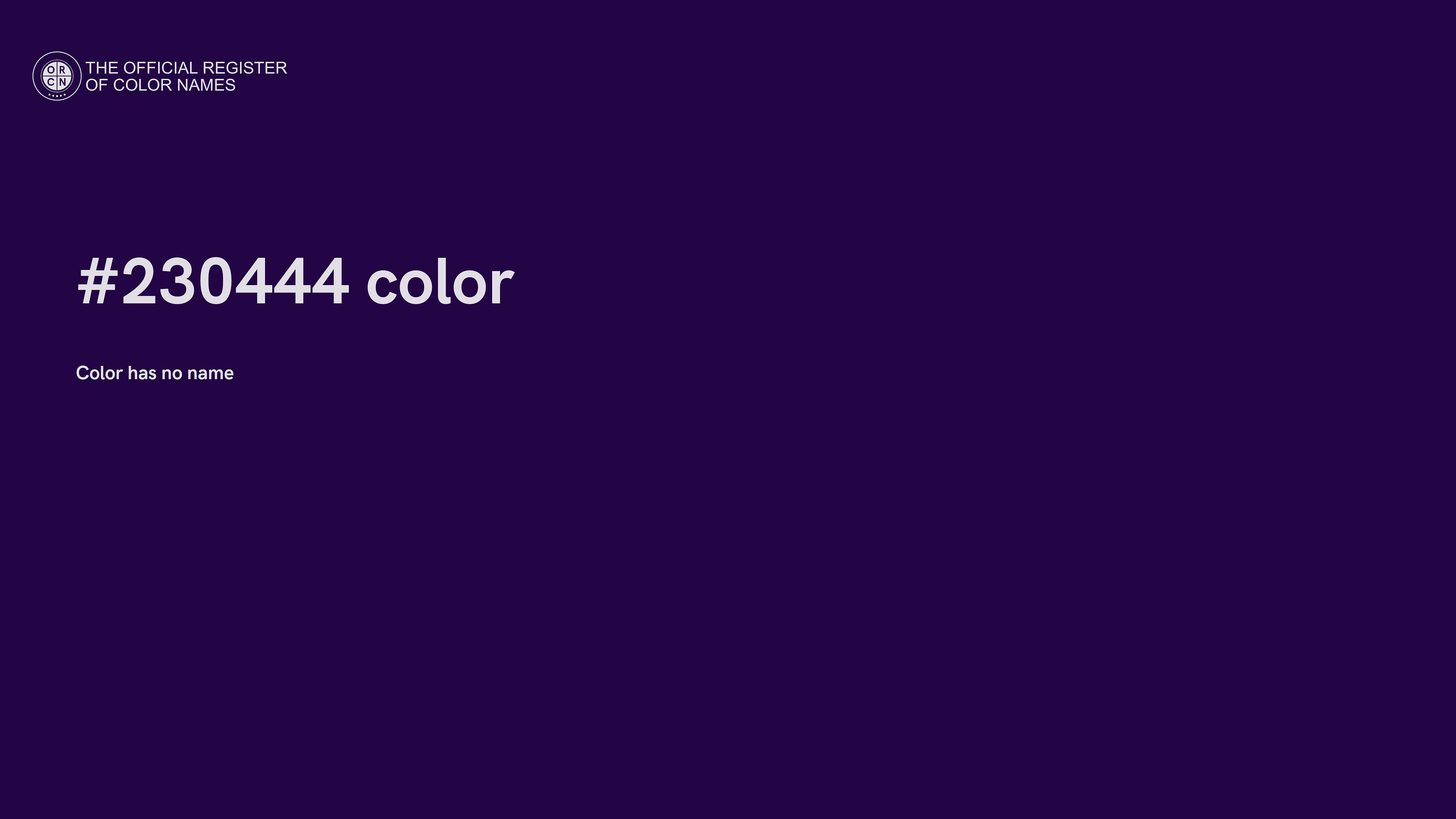 The digital color HEX #230444 belongs to the Violet Color Family featuring Full Saturation (Saturation Family) and Dark (Brightness Family).