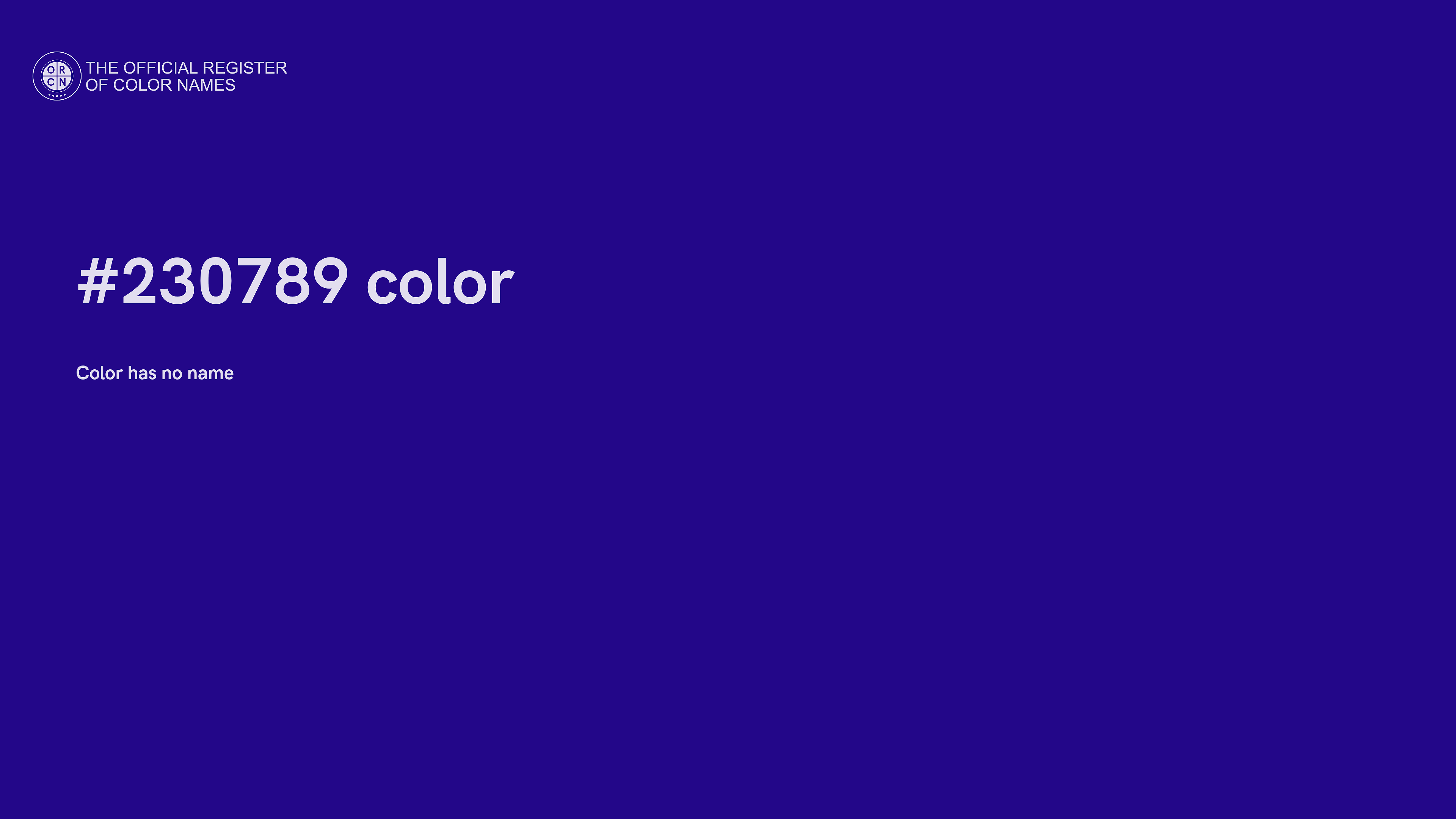 The digital color HEX #230789 belongs to the Blue Color Family featuring Full Saturation (Saturation Family) and Neutral (Brightness Family).