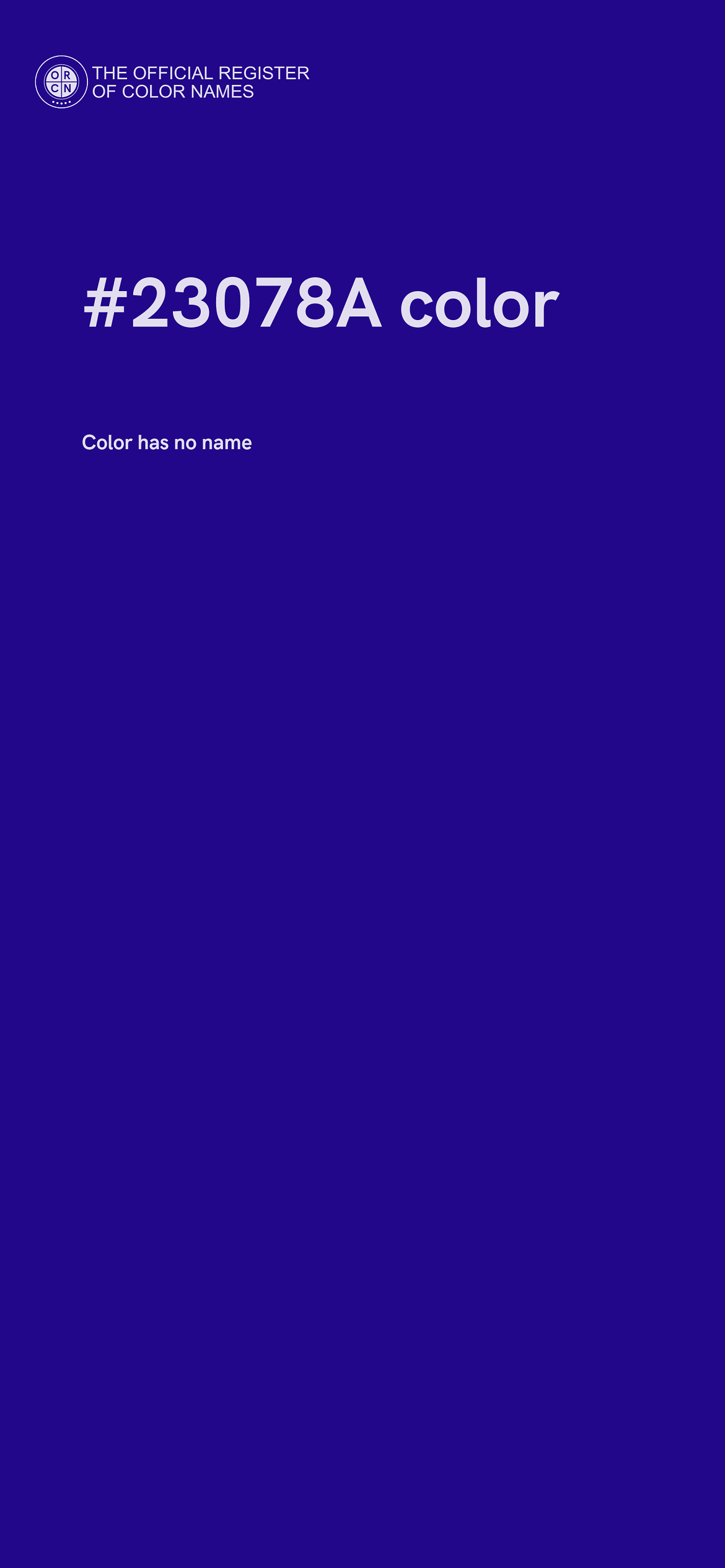 The digital color HEX #23078A belongs to the Blue Color Family featuring Full Saturation (Saturation Family) and Neutral (Brightness Family).