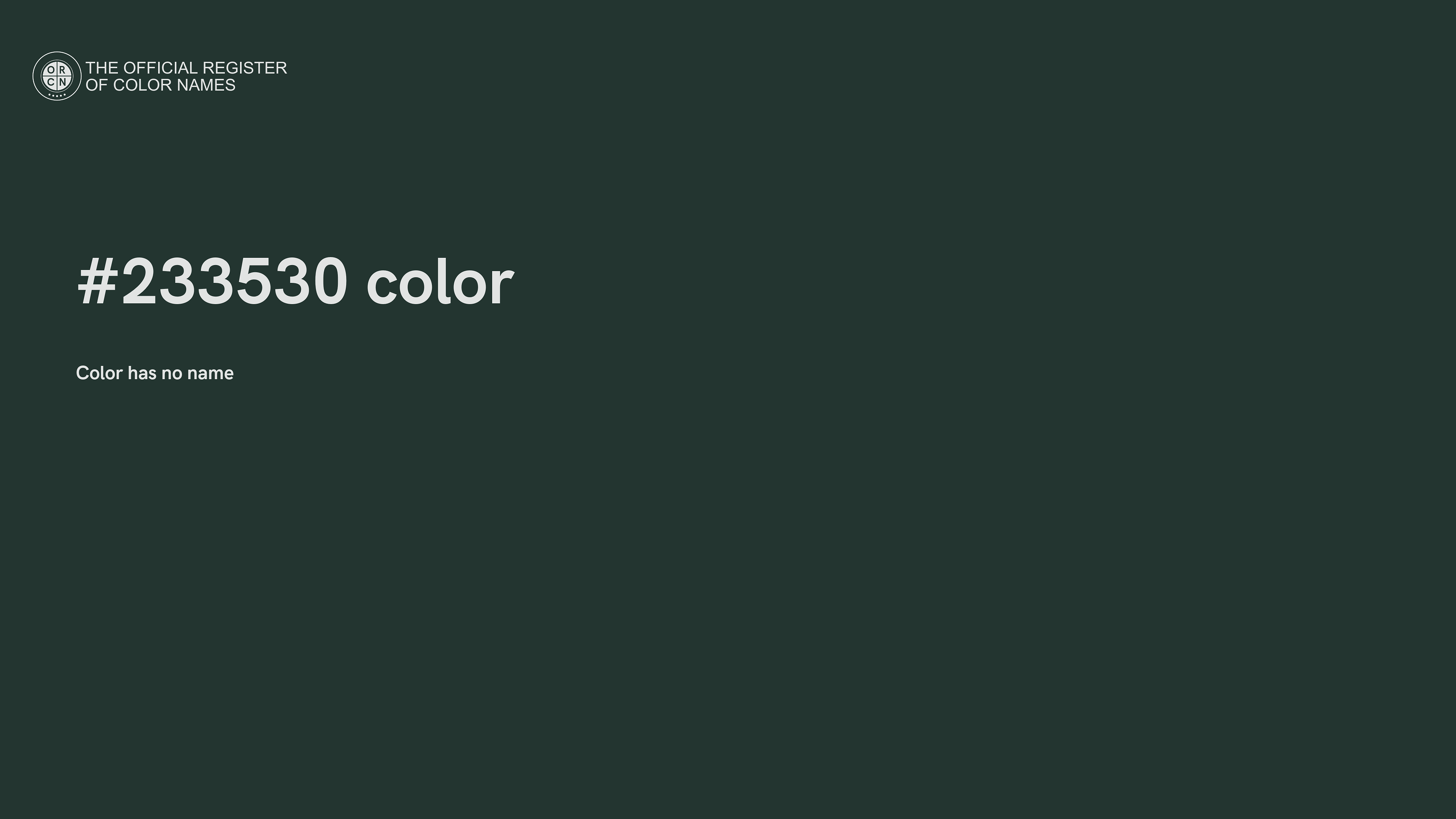 The digital color HEX #233530 belongs to the Spring Green Color Family featuring Low Saturation (Saturation Family) and Dark (Brightness Family).