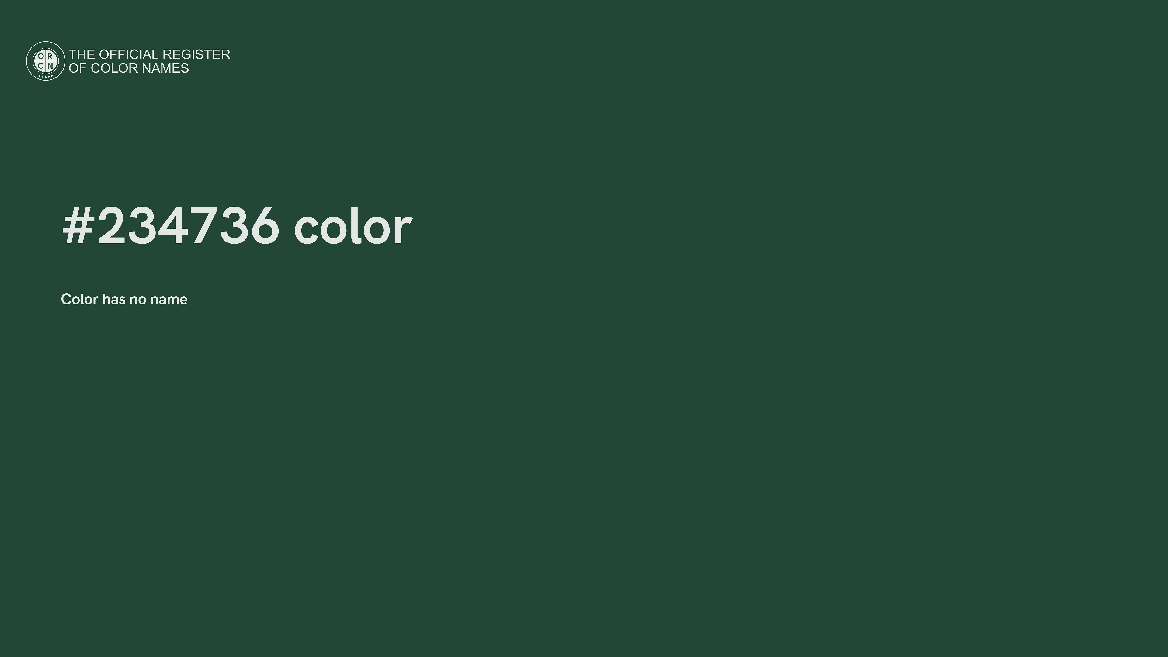 The digital color HEX #234736 belongs to the Spring Green Color Family featuring Mild Saturation (Saturation Family) and Dark (Brightness Family).