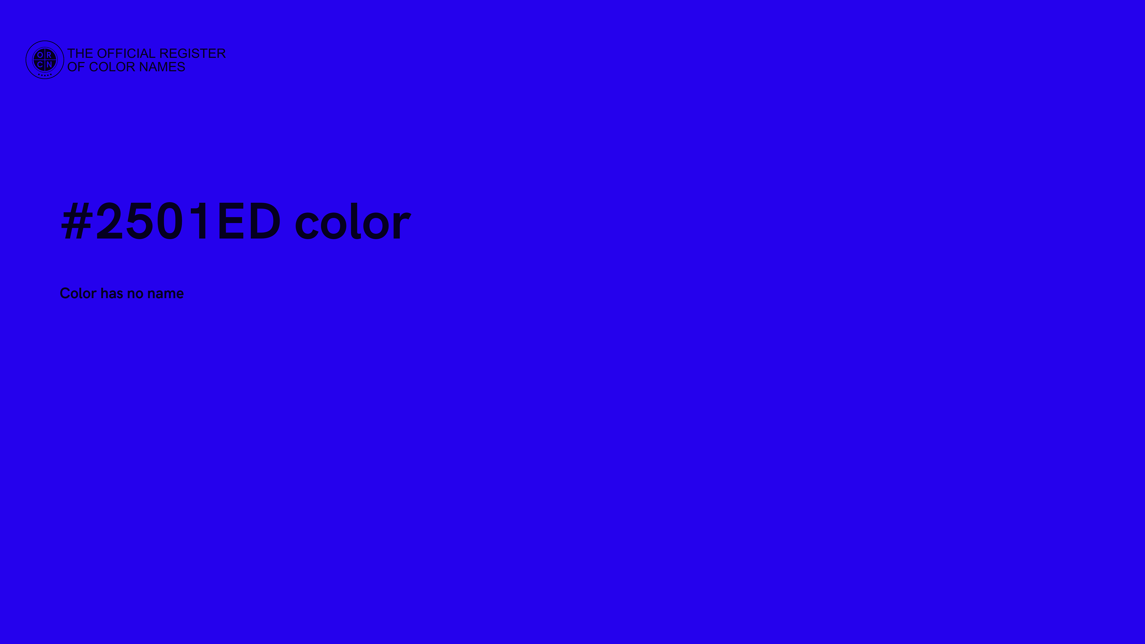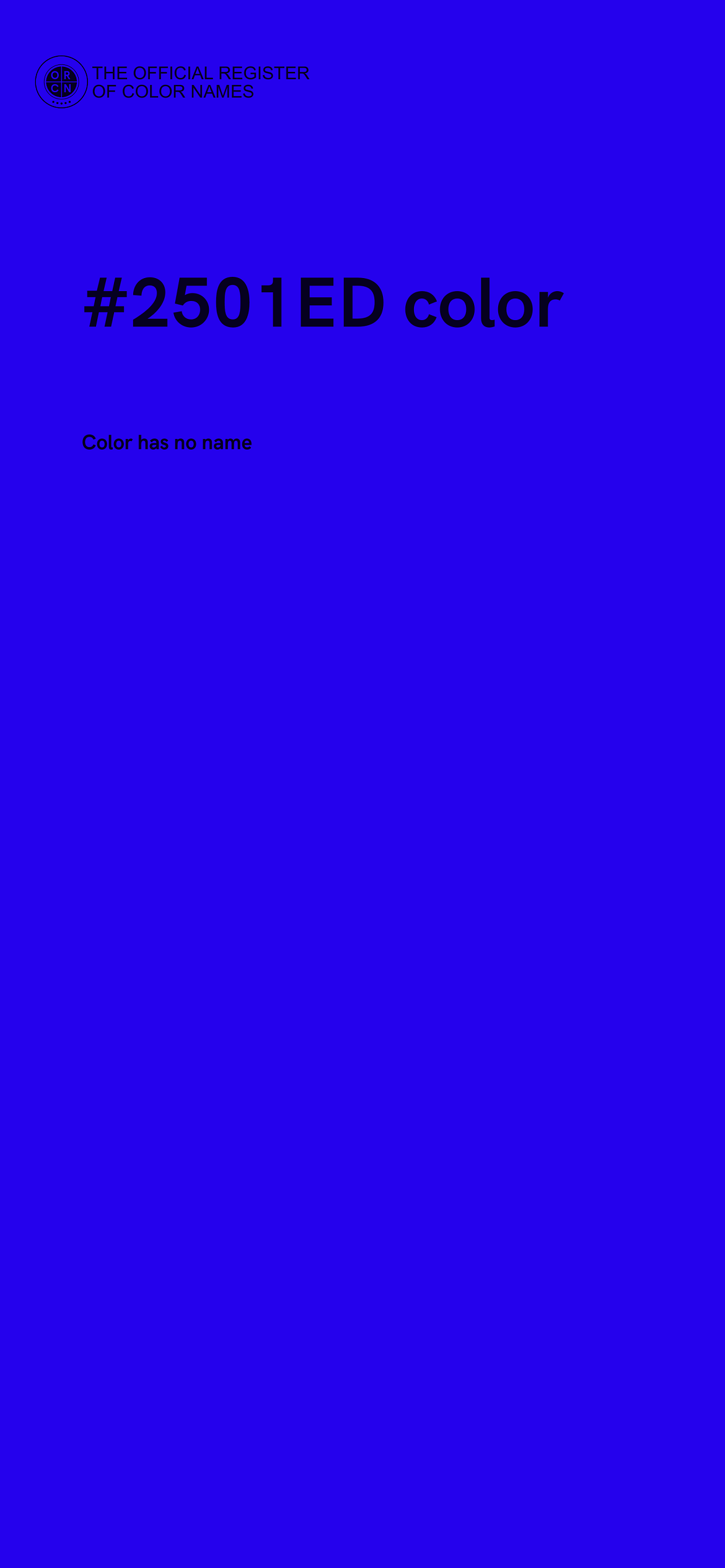For printing in non digital world, #2501ED is represented in CMYK as 78 Cyan, 93 Magenta, 0 Yellow, and 7 Black (Key) (C:78 M:93 Y:0 K:7).