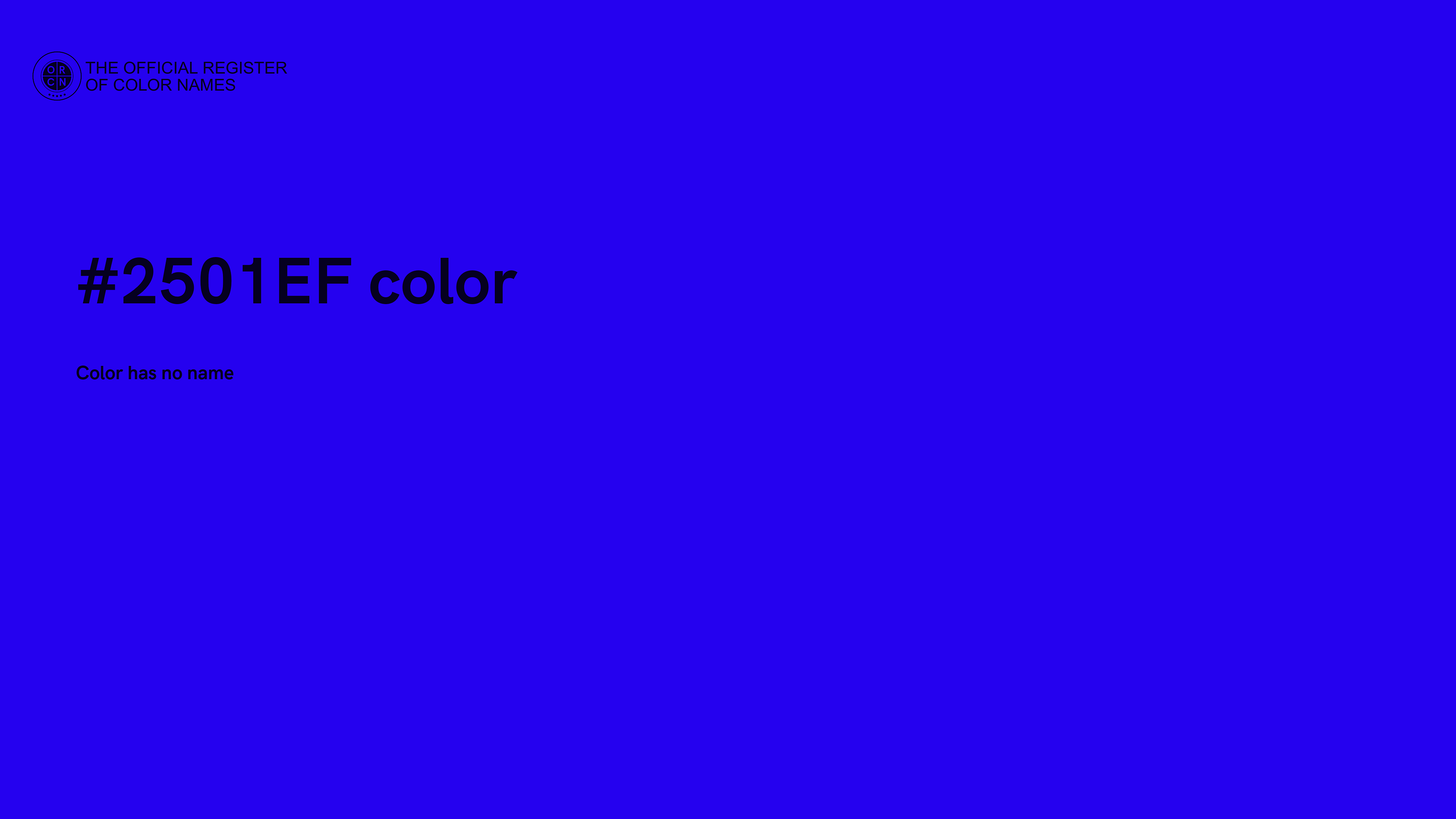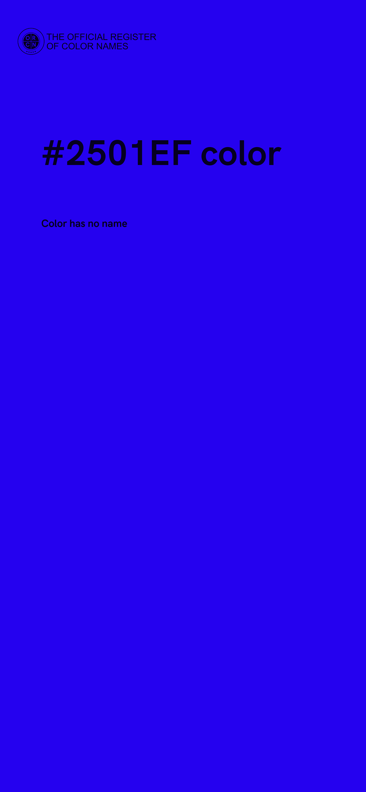 For printing in non digital world, #2501EF is represented in CMYK as 79 Cyan, 93 Magenta, 0 Yellow, and 6 Black (Key) (C:79 M:93 Y:0 K:6).