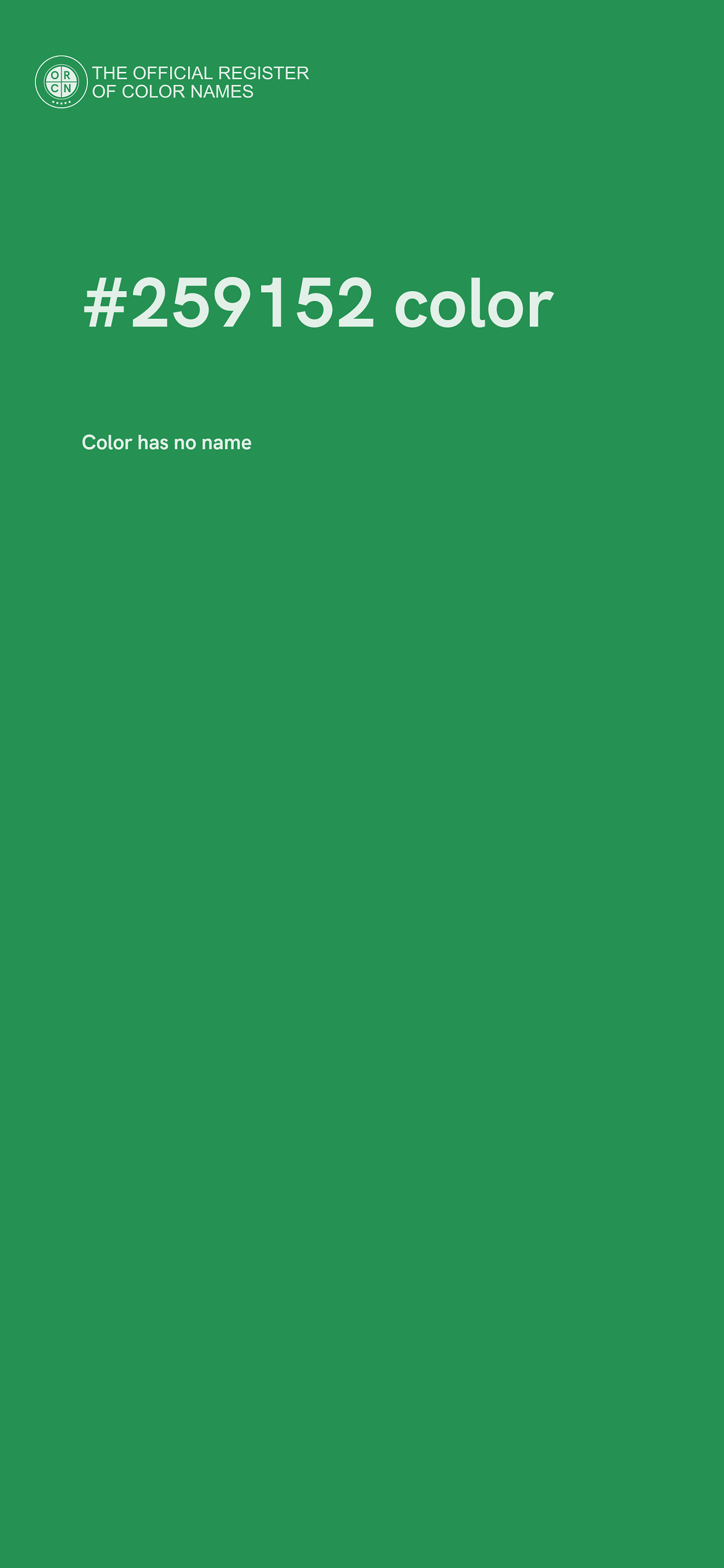 The digital color HEX #259152 belongs to the Spring Green Color Family featuring Moderate Saturation (Saturation Family) and Neutral (Brightness Family).