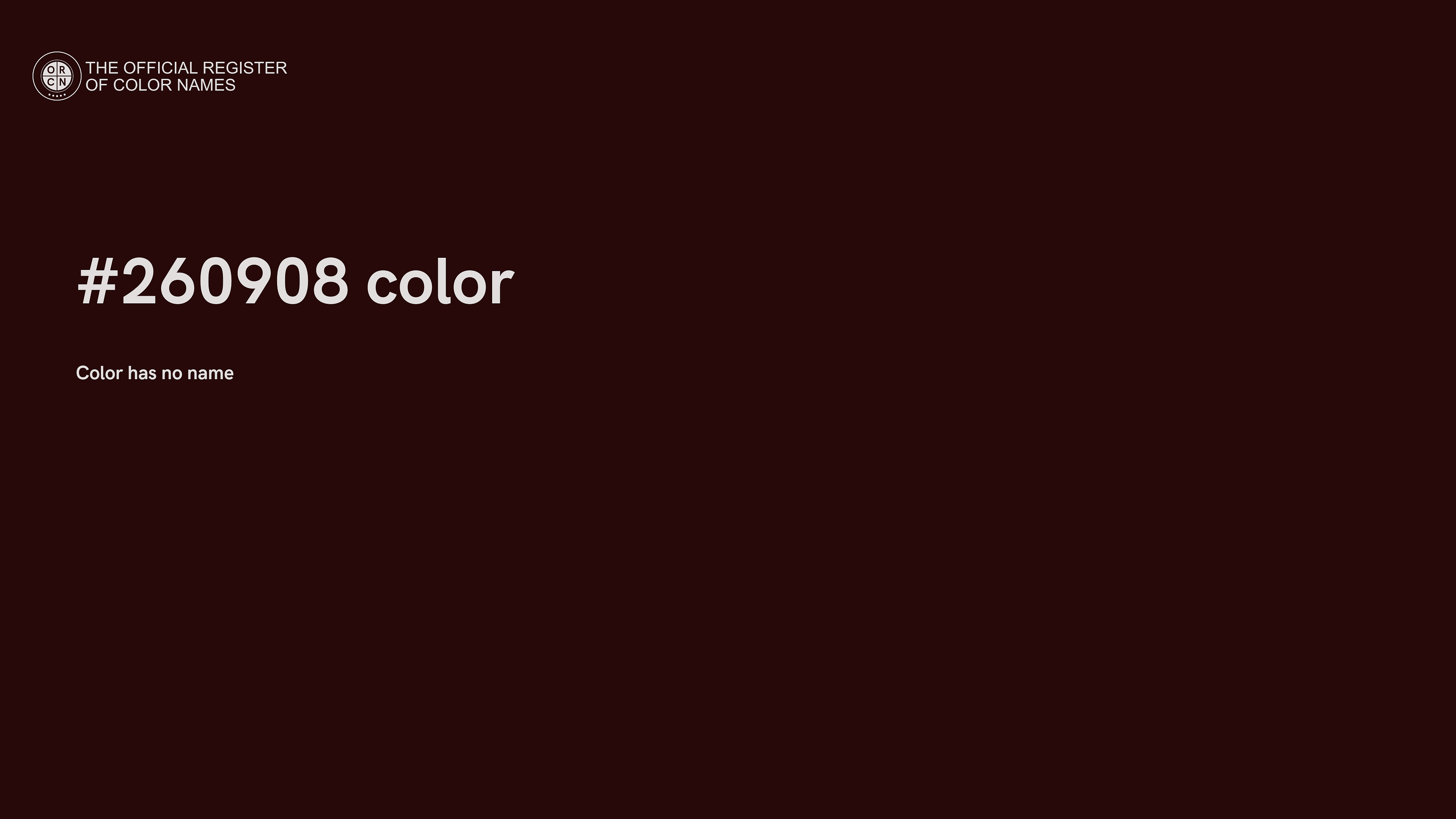 The digital color HEX #260908 belongs to the Red Color Family featuring High Saturation (Saturation Family) and Very Dark (Brightness Family).