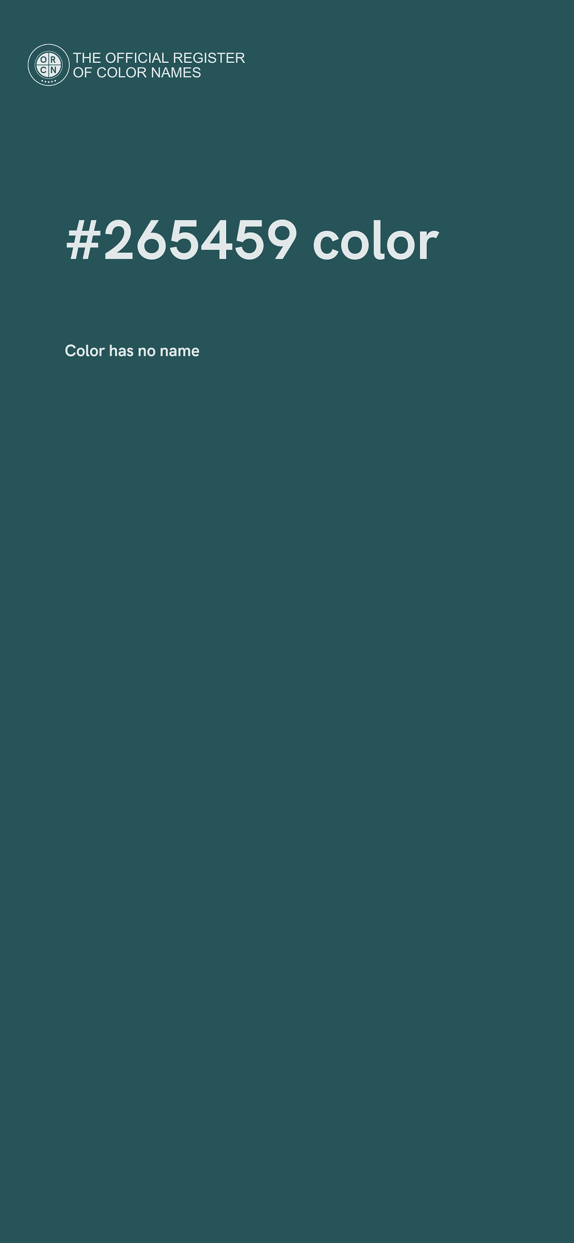The digital color HEX #265459 belongs to the Cyan Color Family featuring Moderate Saturation (Saturation Family) and Neutral (Brightness Family).