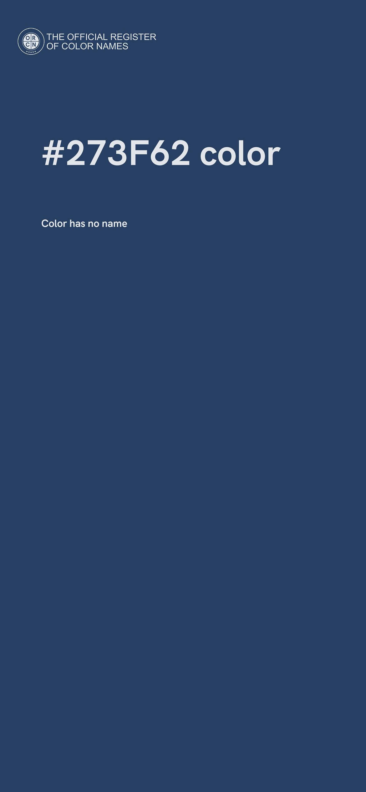 The digital color HEX #273F62 belongs to the Azure Color Family featuring Moderate Saturation (Saturation Family) and Neutral (Brightness Family).