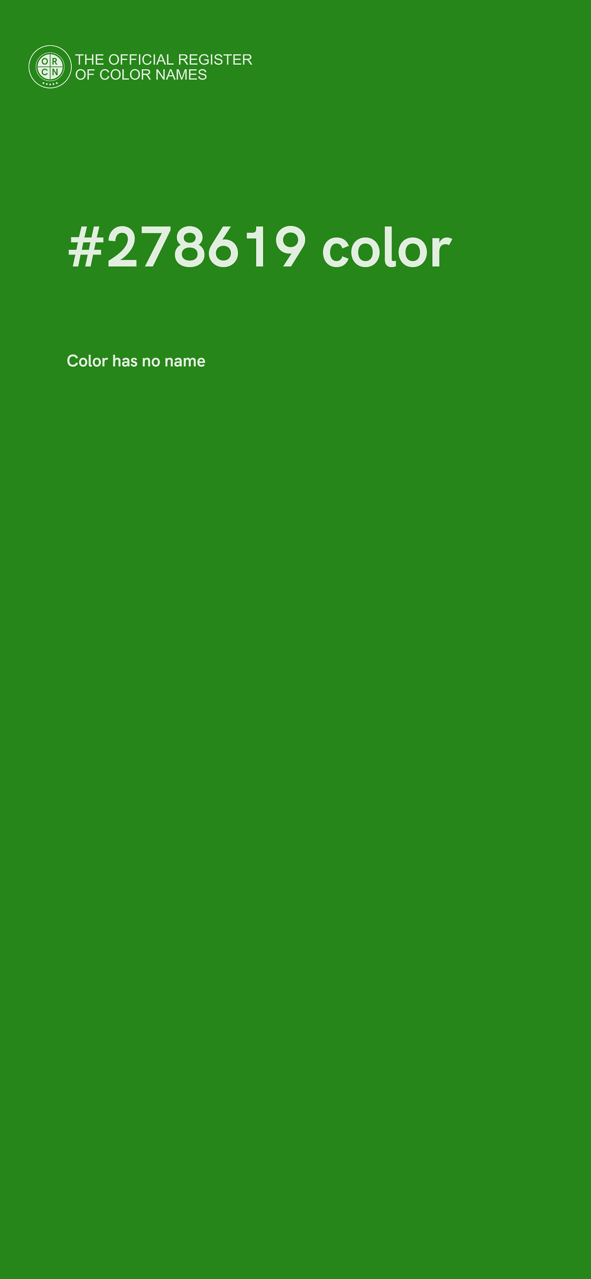The digital color HEX #278619 belongs to the Green Color Family featuring High Saturation (Saturation Family) and Neutral (Brightness Family).