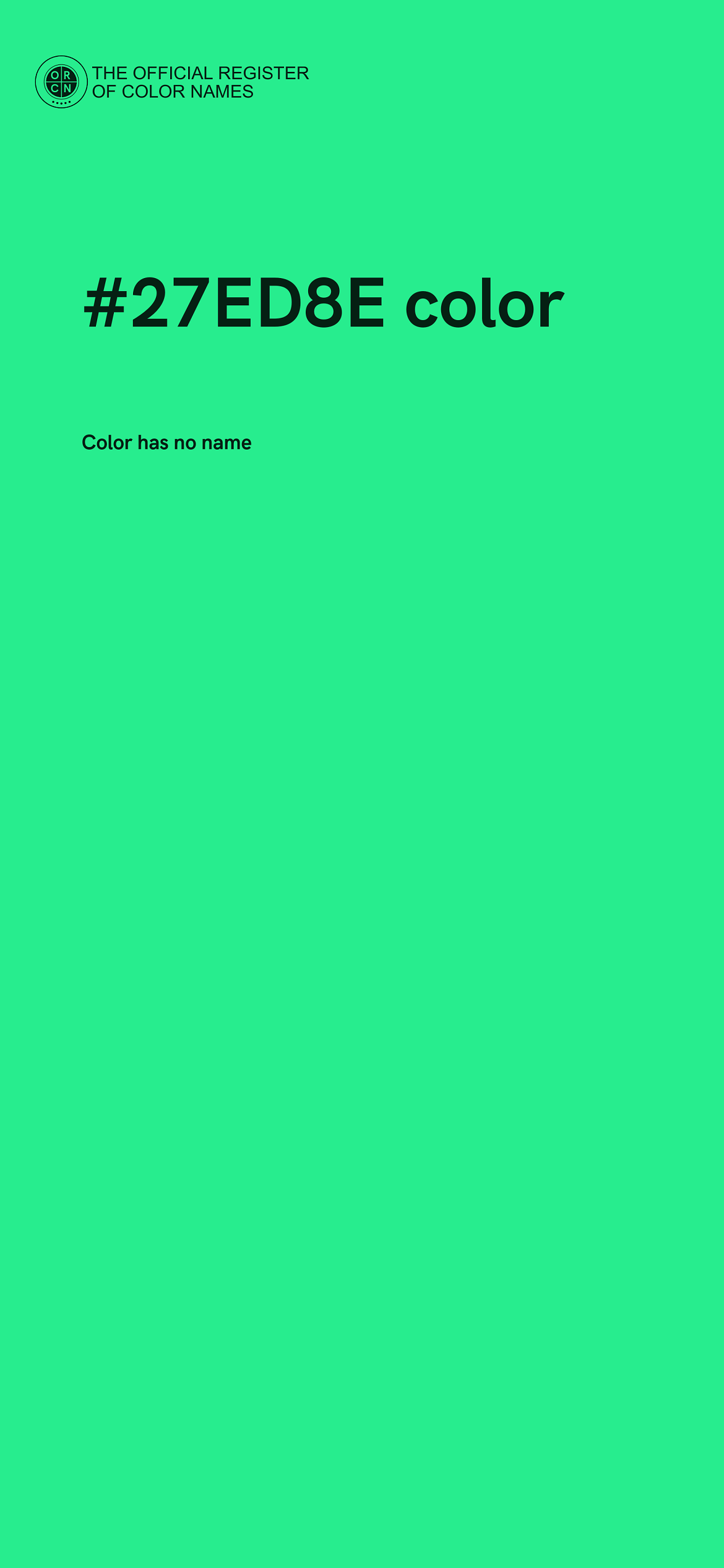 The digital color HEX #27ED8E belongs to the Spring Green Color Family featuring Full Saturation (Saturation Family) and Light (Brightness Family).