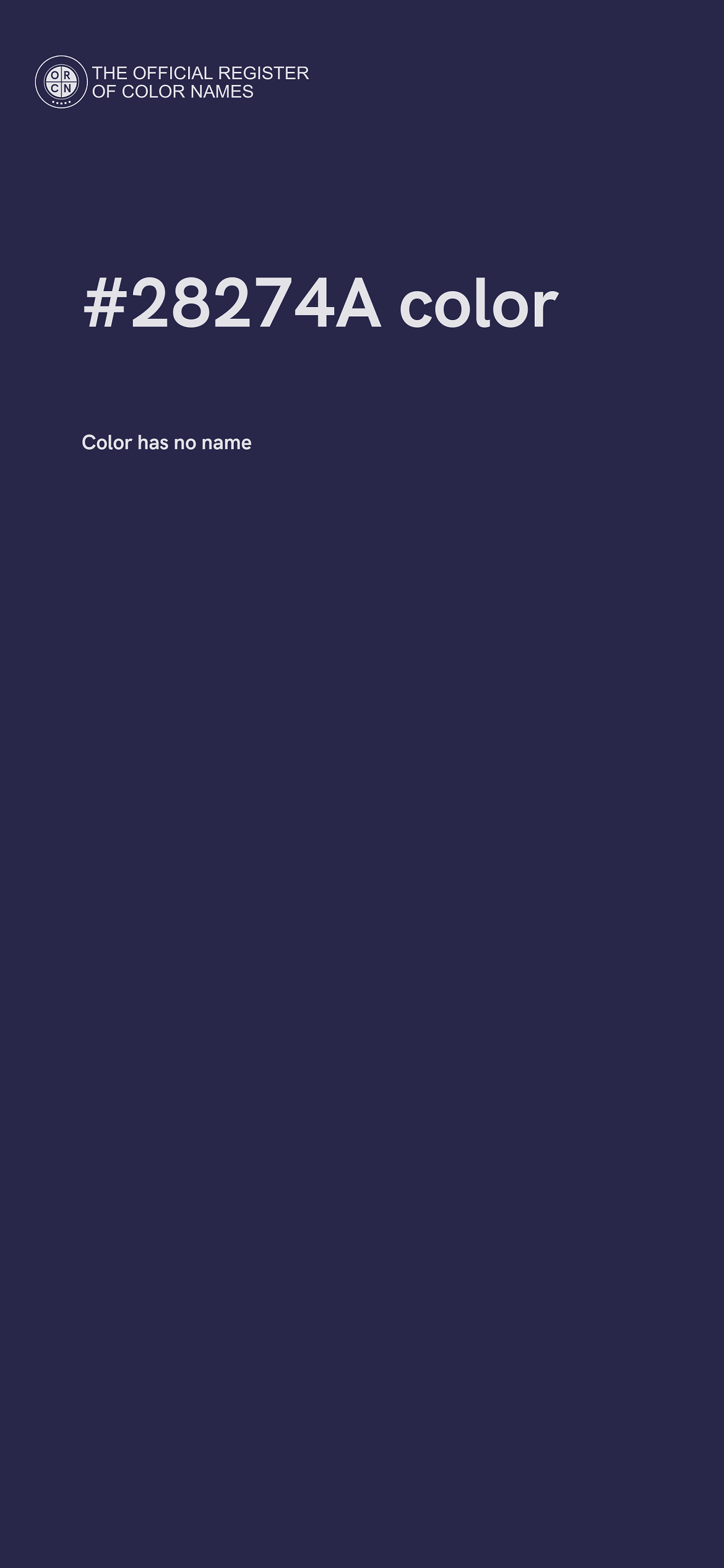 The digital color HEX #28274A belongs to the Blue Color Family featuring Mild Saturation (Saturation Family) and Dark (Brightness Family).