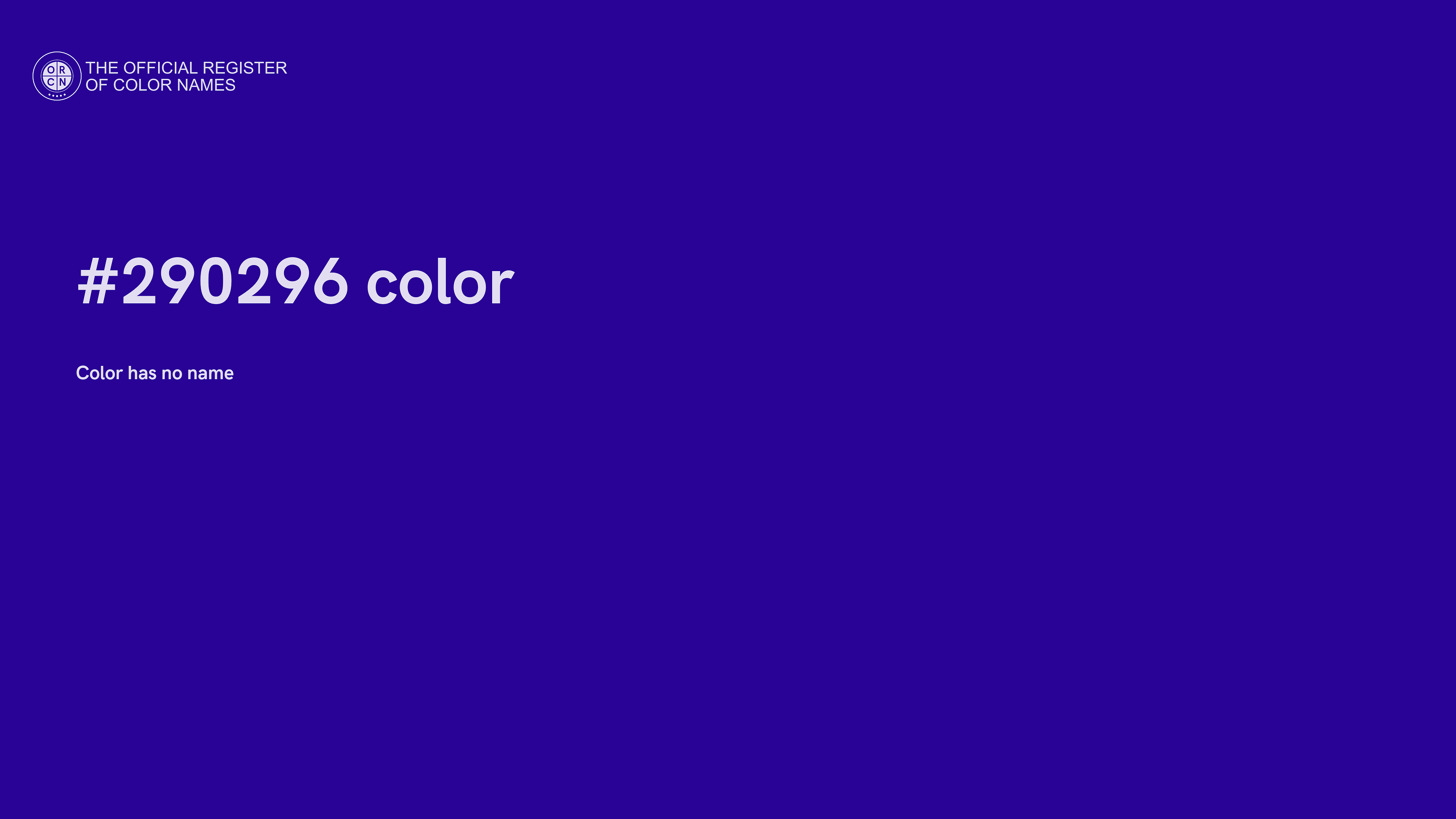 The digital color HEX #290296 belongs to the Violet Color Family featuring Full Saturation (Saturation Family) and Neutral (Brightness Family).