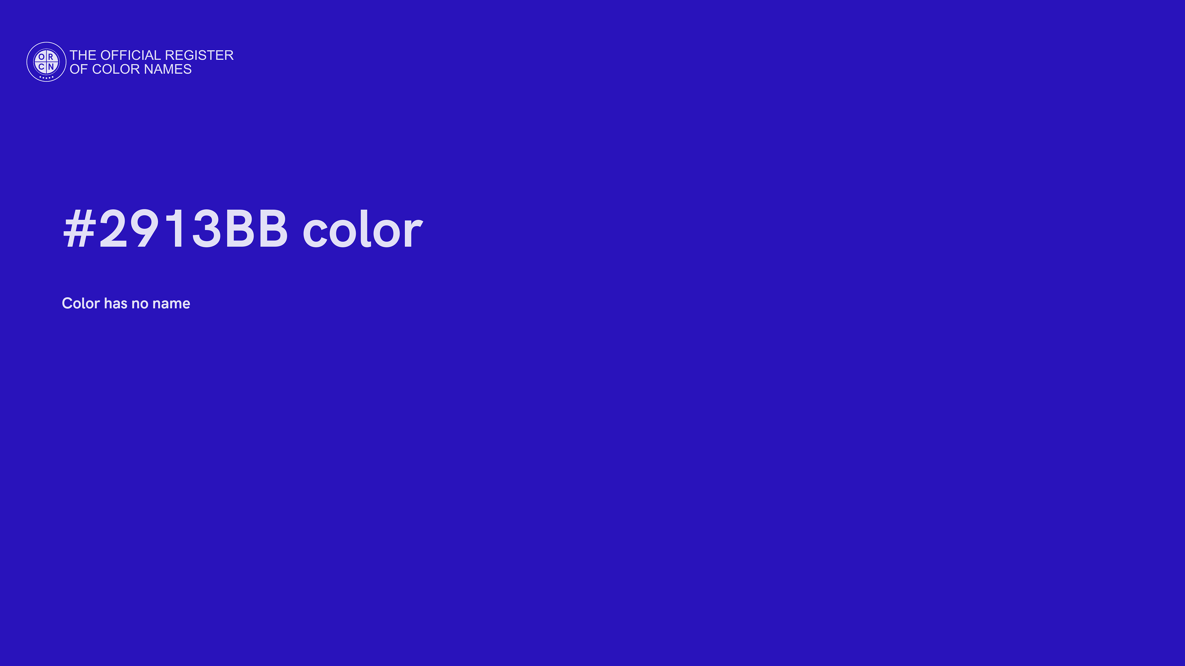 HEX code #2913BB represent the color in hexadecimal format by combining three values – the amounts of Red, Green and Blue (RGB). Its RGB composition is 41, 19, 187 ( rgb(41, 19, 187) ), which breaks down into 16.1% of Red, 7.5% Green and 73.3% Blue.