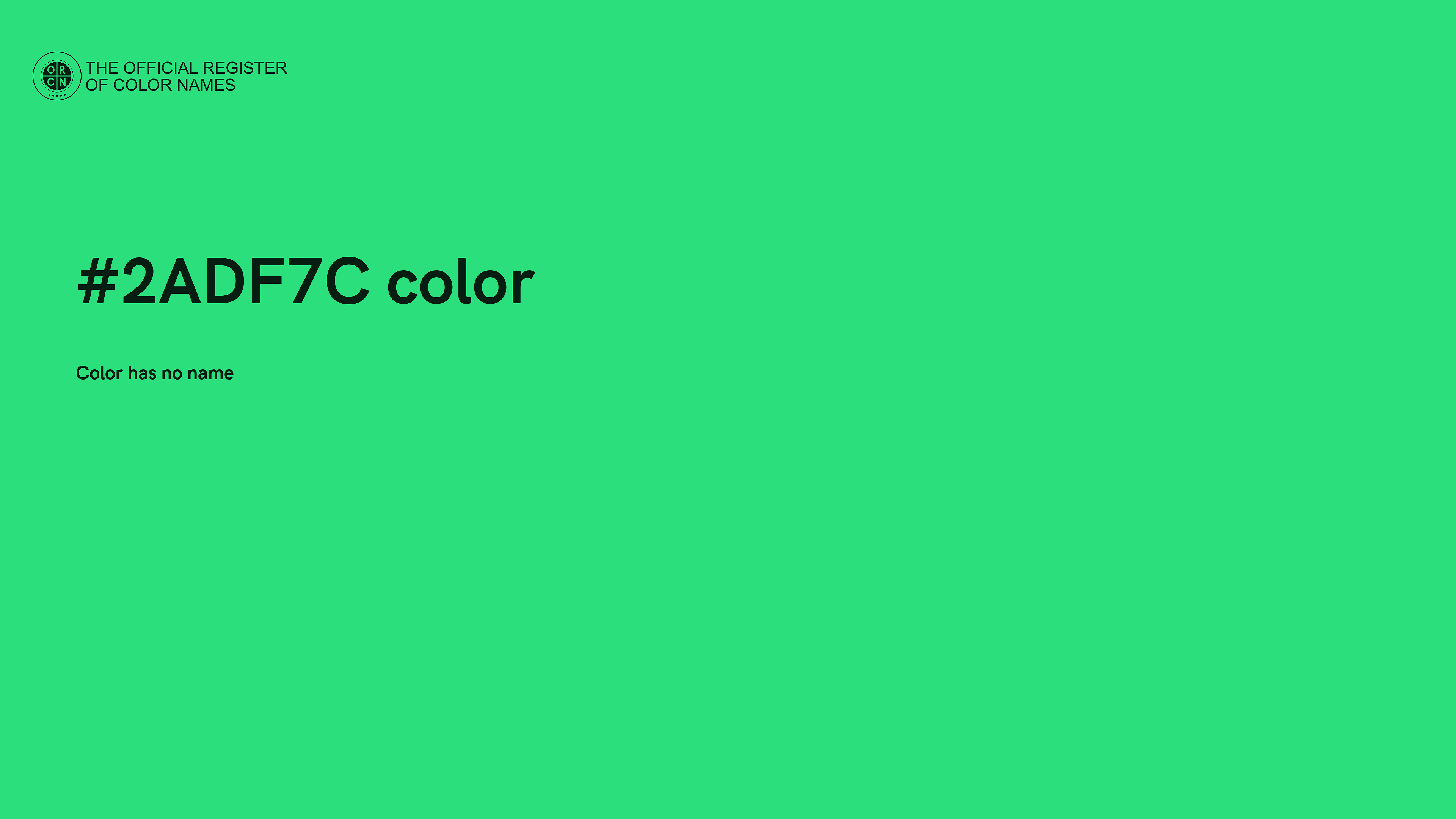 The digital color HEX #2ADF7C belongs to the Spring Green Color Family featuring High Saturation (Saturation Family) and Light (Brightness Family).