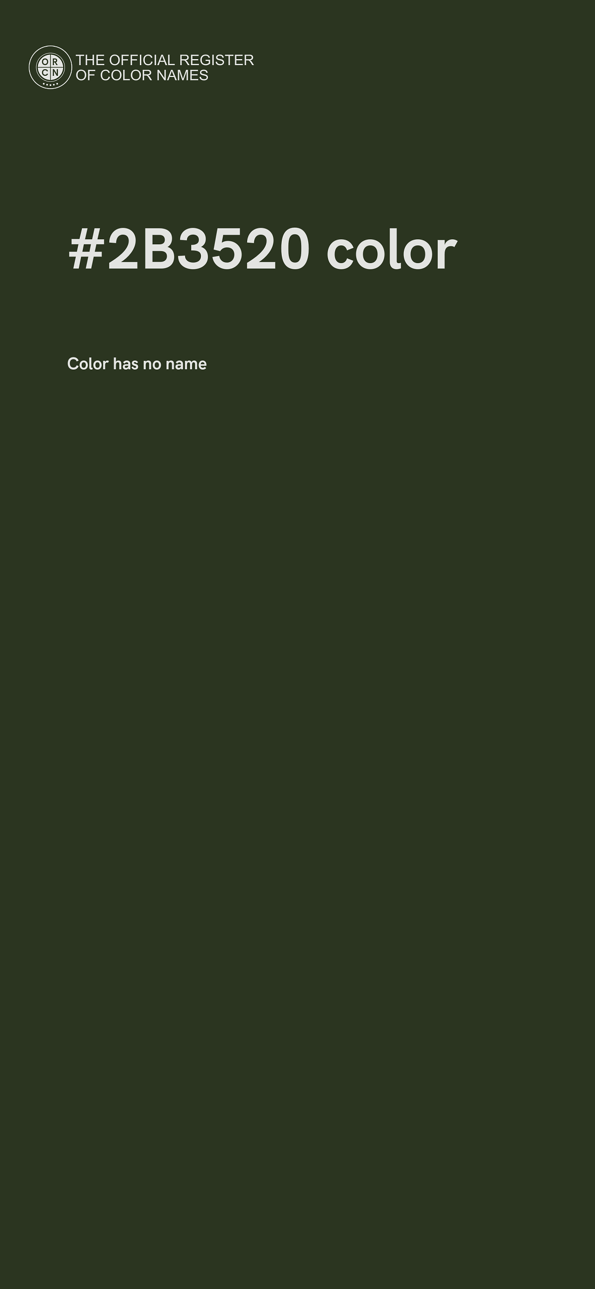 The digital color HEX #2B3520 belongs to the Chartreuse Color Family featuring Mild Saturation (Saturation Family) and Dark (Brightness Family).