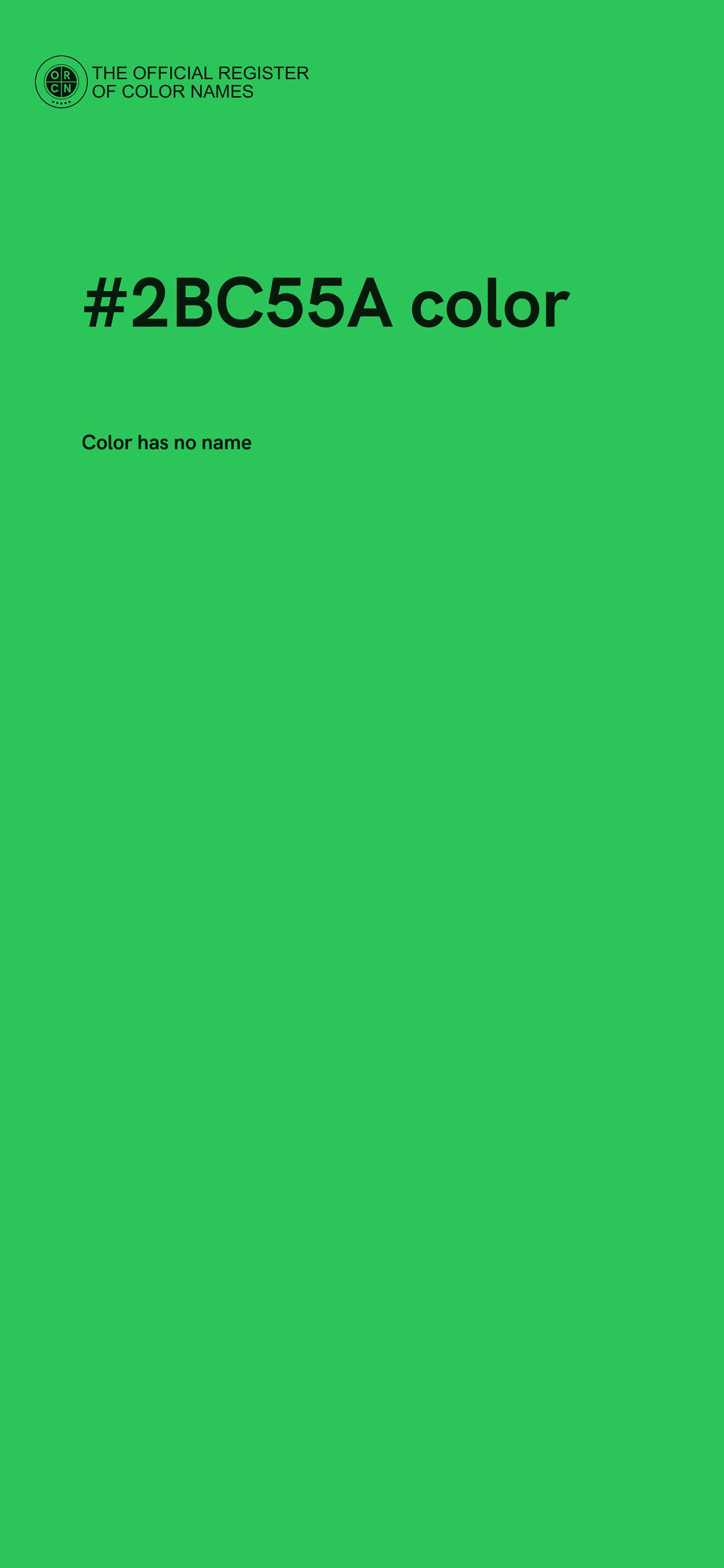 The digital color HEX #2BC55A belongs to the Spring Green Color Family featuring High Saturation (Saturation Family) and Light (Brightness Family).