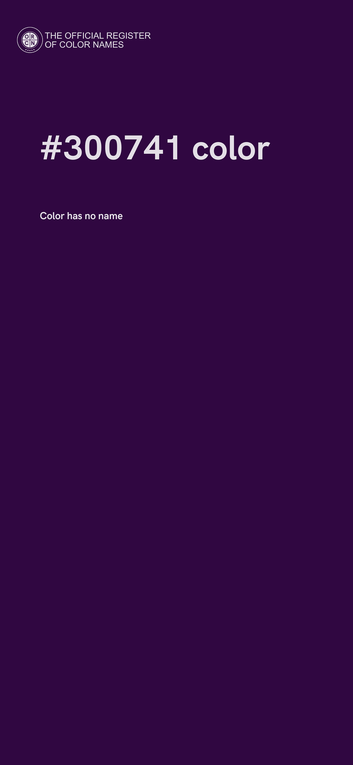 The digital color HEX #300741 belongs to the Violet Color Family featuring High Saturation (Saturation Family) and Dark (Brightness Family).