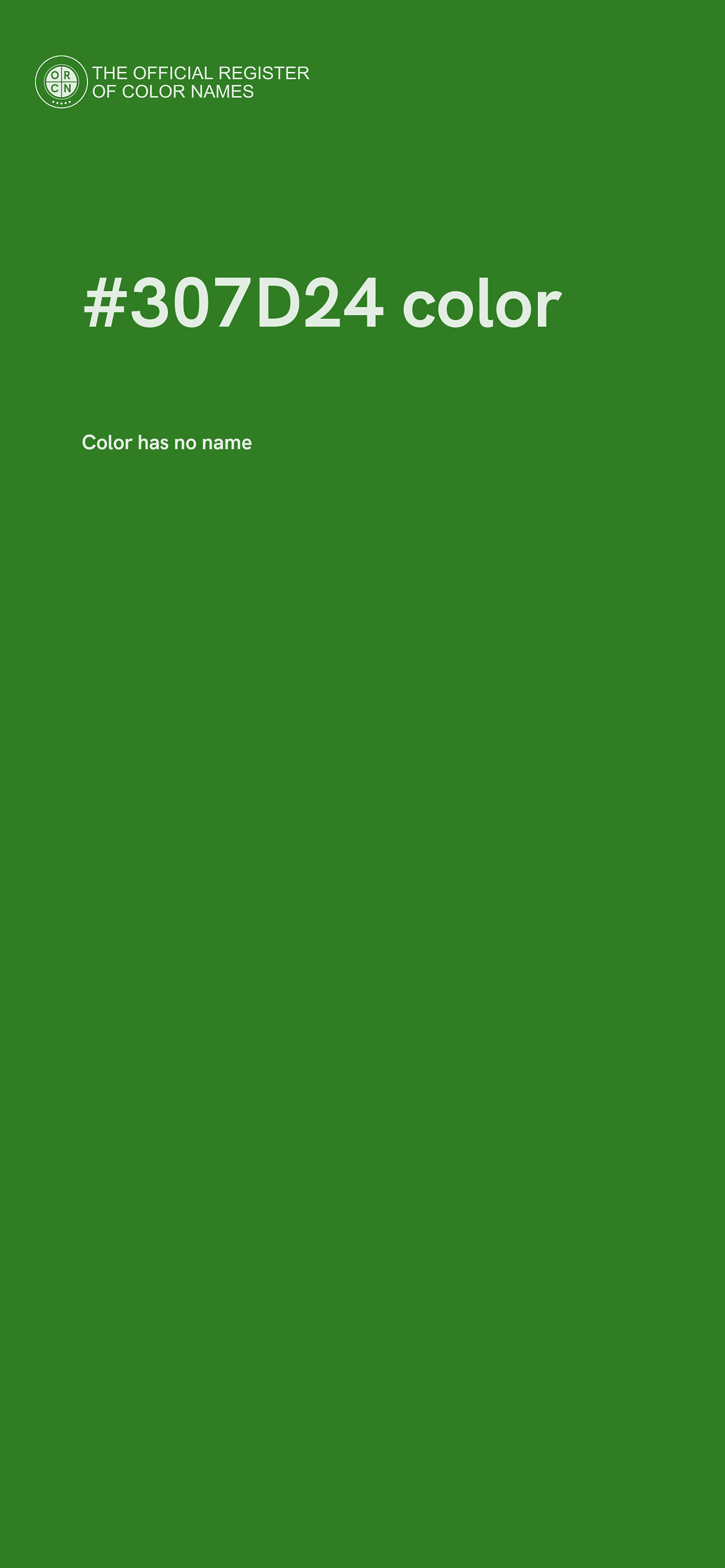 The digital color HEX #307D24 belongs to the Green Color Family featuring Moderate Saturation (Saturation Family) and Neutral (Brightness Family).