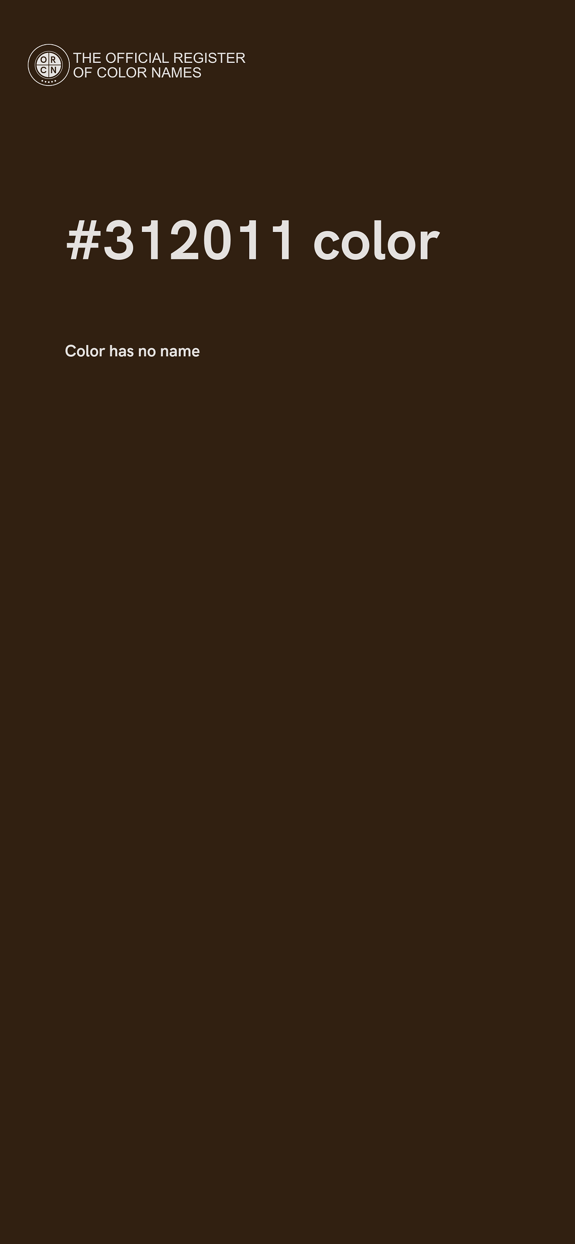 For printing in non digital world, #312011 is represented in CMYK as 0 Cyan, 7 Magenta, 13 Yellow, and 81 Black (Key) (C:0 M:7 Y:13 K:81).