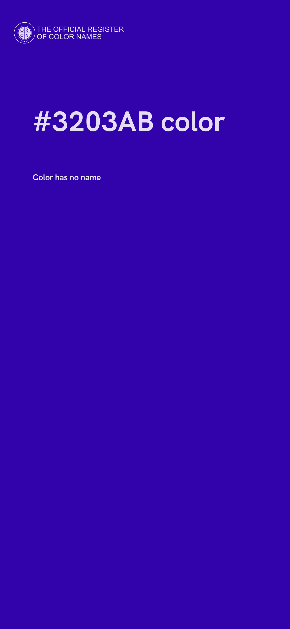 The digital color HEX #3203AB belongs to the Violet Color Family featuring Full Saturation (Saturation Family) and Neutral (Brightness Family).
