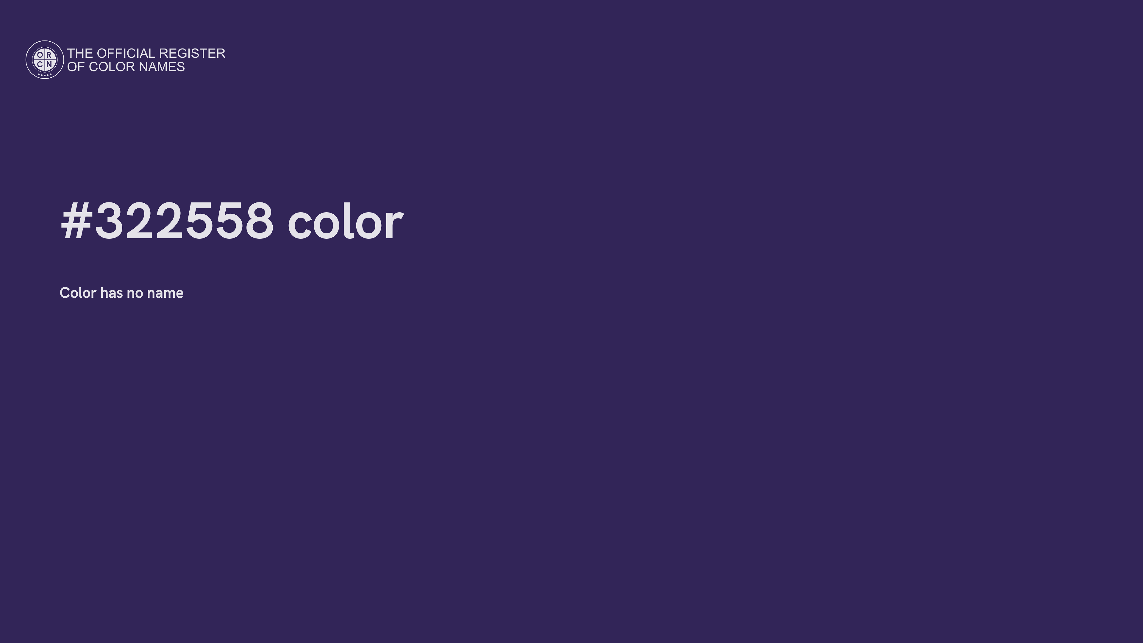 The digital color HEX #322558 belongs to the Violet Color Family featuring Moderate Saturation (Saturation Family) and Neutral (Brightness Family).