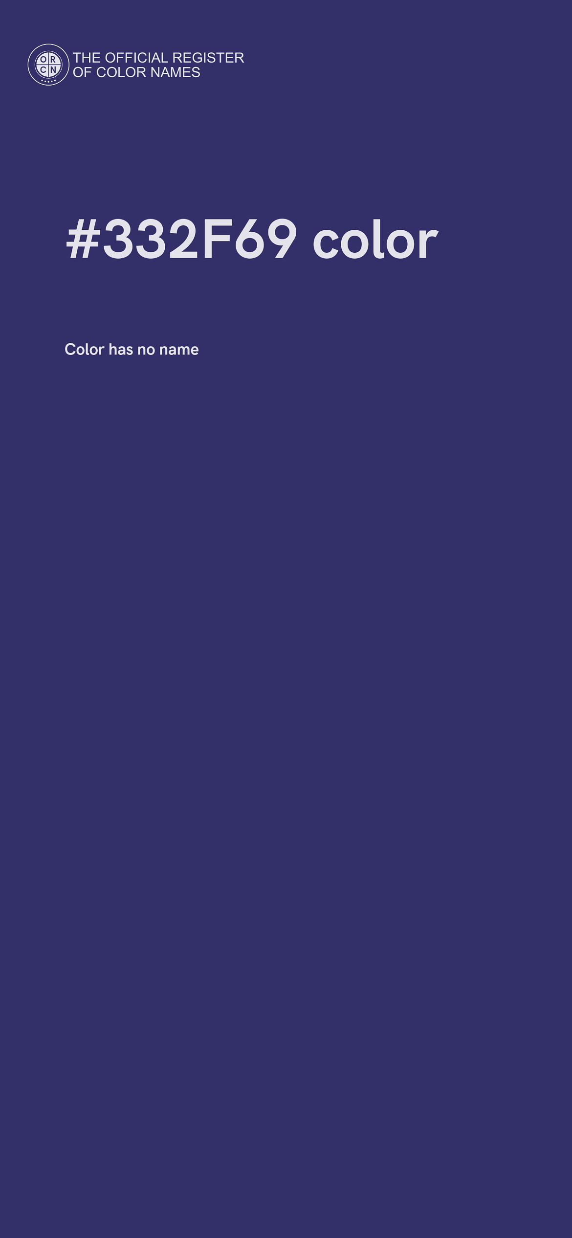 The digital color HEX #332F69 belongs to the Blue Color Family featuring Mild Saturation (Saturation Family) and Neutral (Brightness Family).