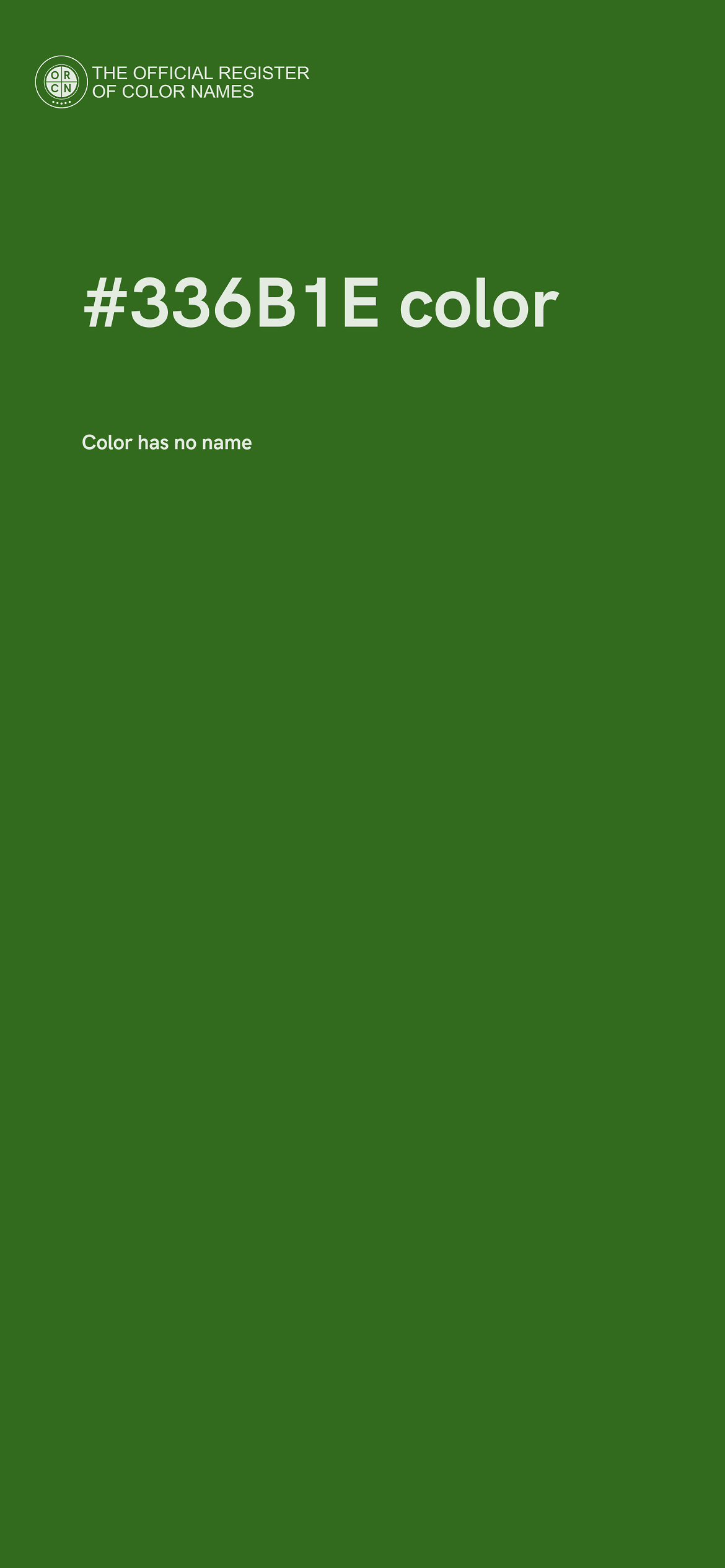 The digital color HEX #336B1E belongs to the Chartreuse Color Family featuring Moderate Saturation (Saturation Family) and Neutral (Brightness Family).