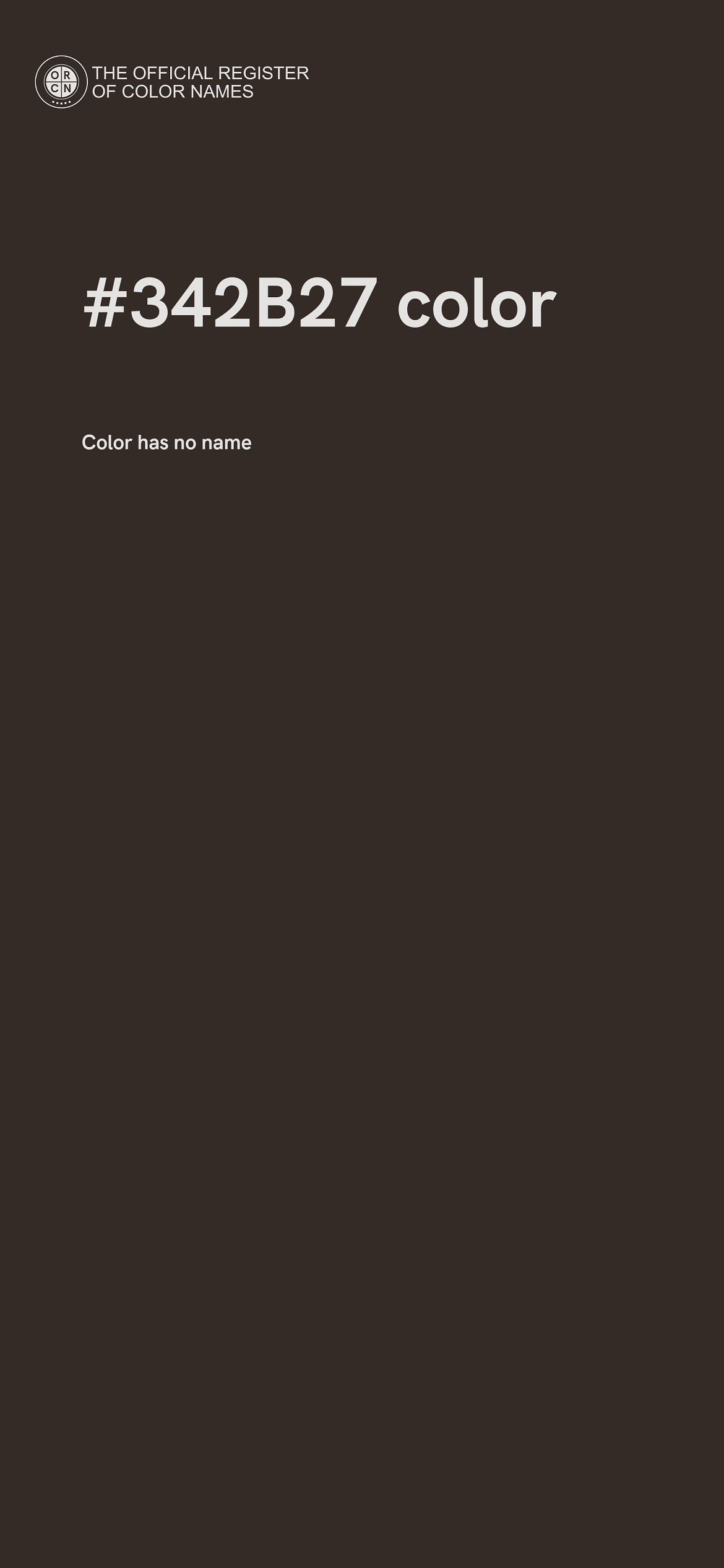 The digital color HEX #342B27 belongs to the Orange Color Family featuring Low Saturation (Saturation Family) and Dark (Brightness Family).
