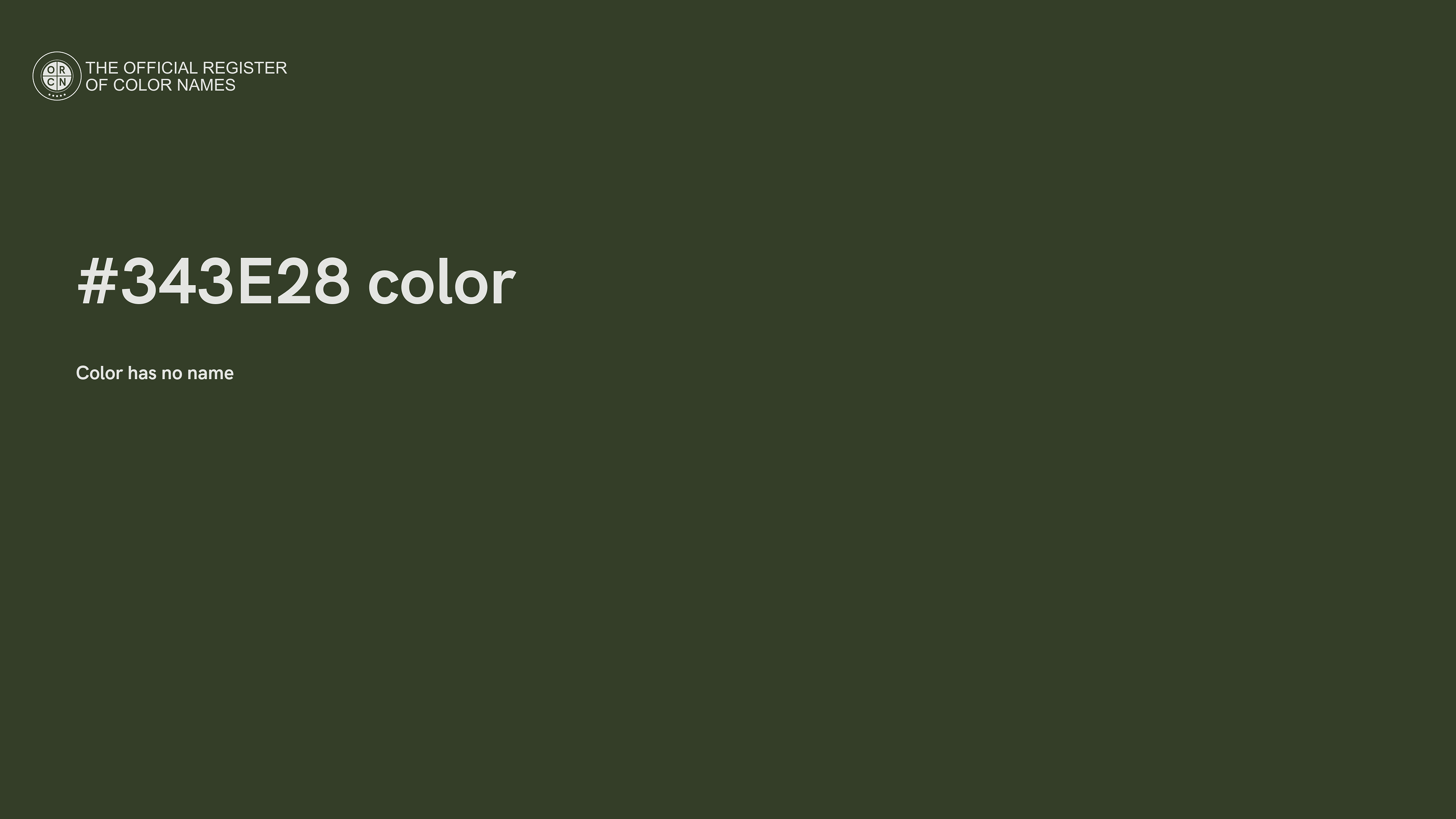 For printing in non digital world, #343E28 is represented in CMYK as 4 Cyan, 0 Magenta, 9 Yellow, and 76 Black (Key) (C:4 M:0 Y:9 K:76).