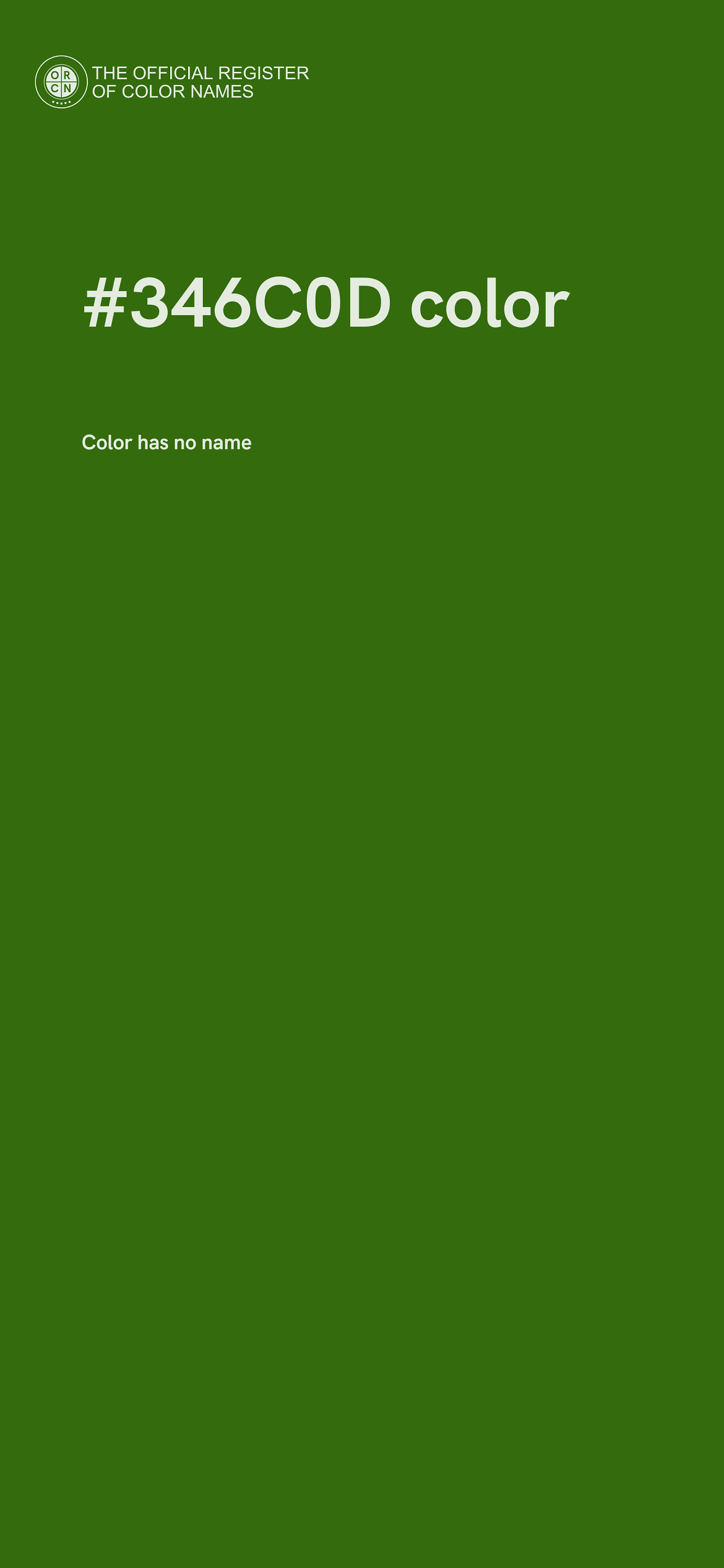 The digital color HEX #346C0D belongs to the Chartreuse Color Family featuring High Saturation (Saturation Family) and Dark (Brightness Family).