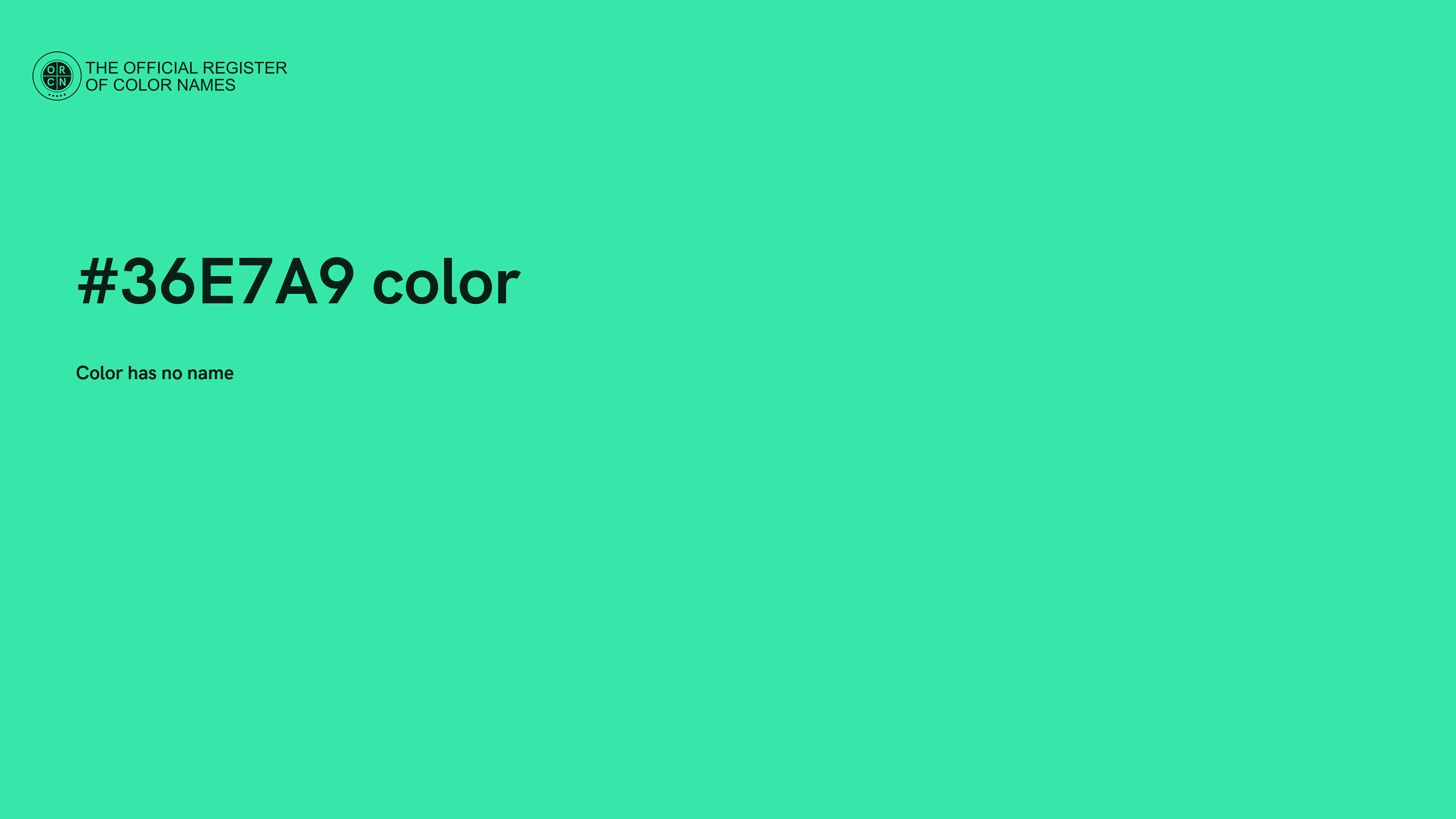 The digital color HEX #36E7A9 belongs to the Spring Green Color Family featuring High Saturation (Saturation Family) and Light (Brightness Family).