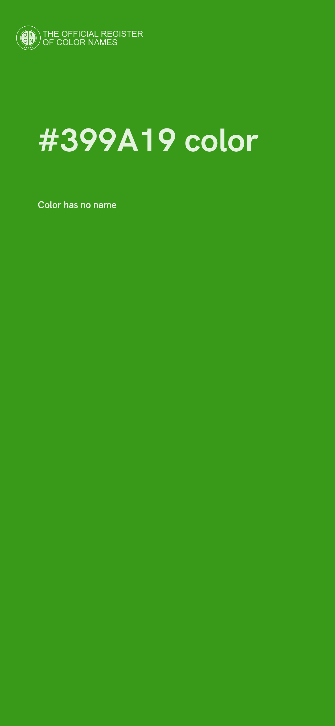 The digital color HEX #399A19 belongs to the Green Color Family featuring High Saturation (Saturation Family) and Neutral (Brightness Family).