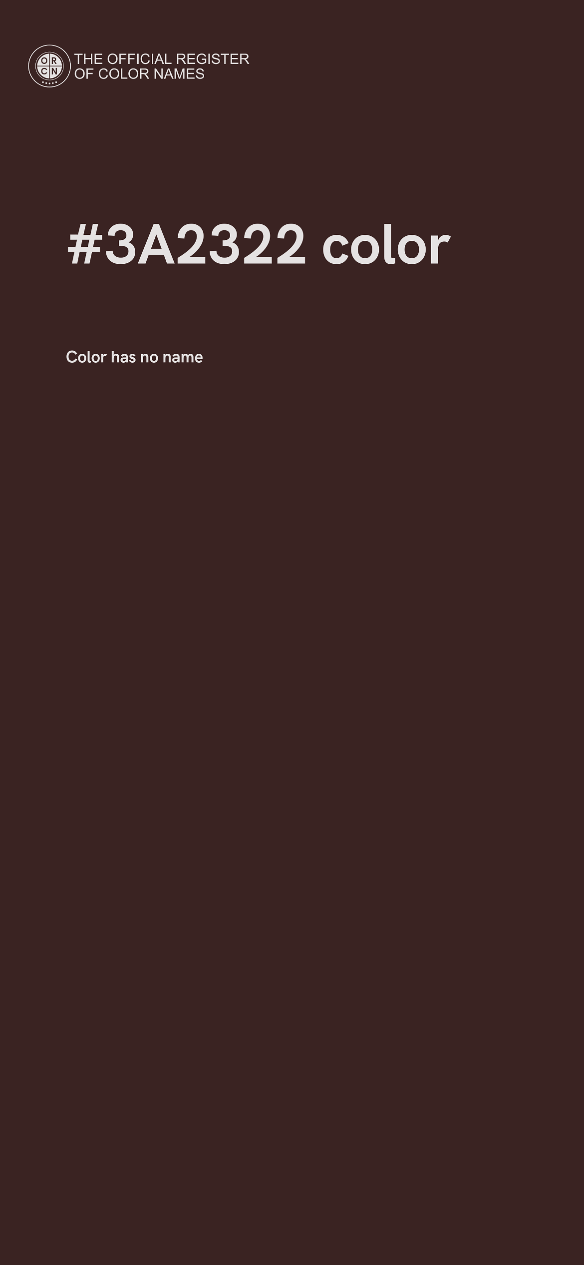 The digital color HEX #3A2322 belongs to the Red Color Family featuring Mild Saturation (Saturation Family) and Dark (Brightness Family).