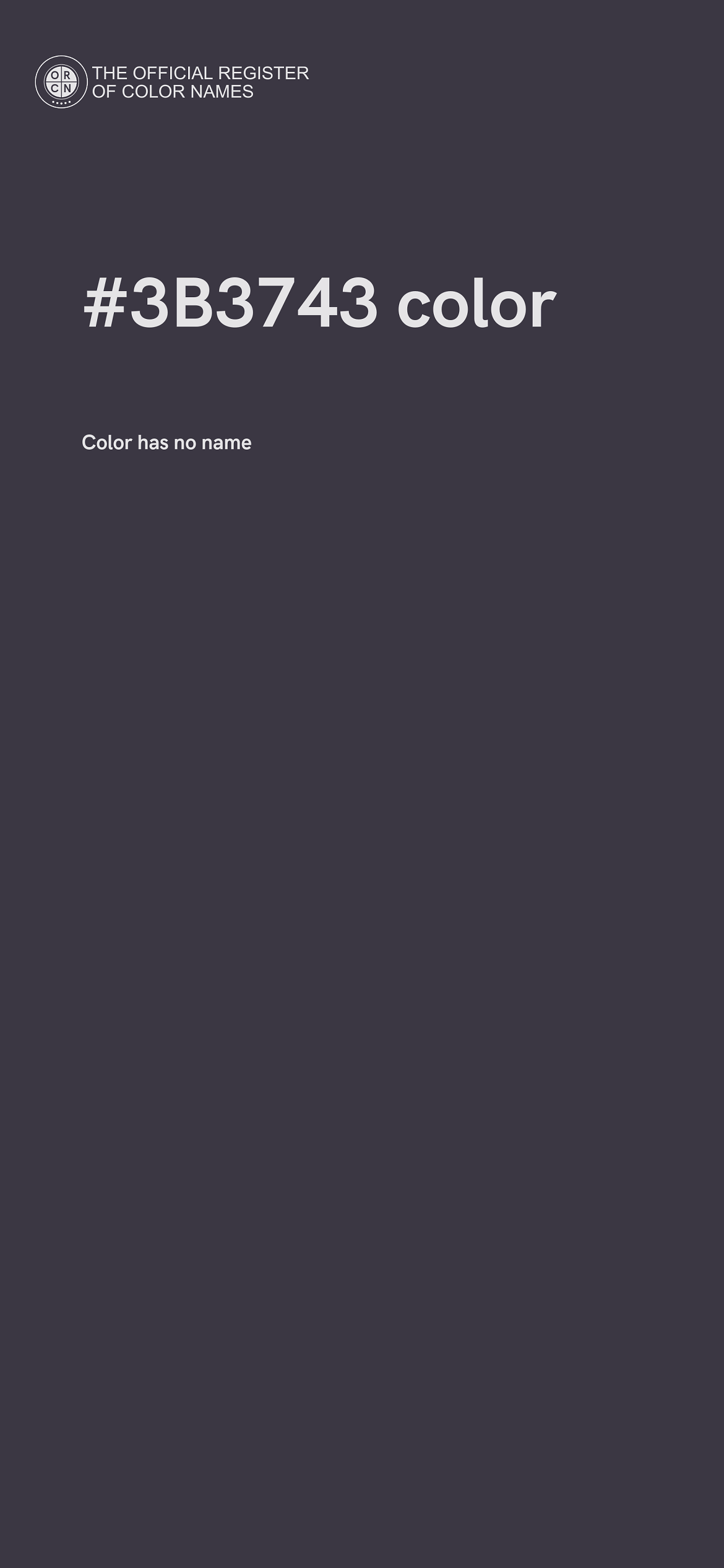 The digital color HEX #3B3743 belongs to the Violet Color Family featuring Low Saturation (Saturation Family) and Dark (Brightness Family).