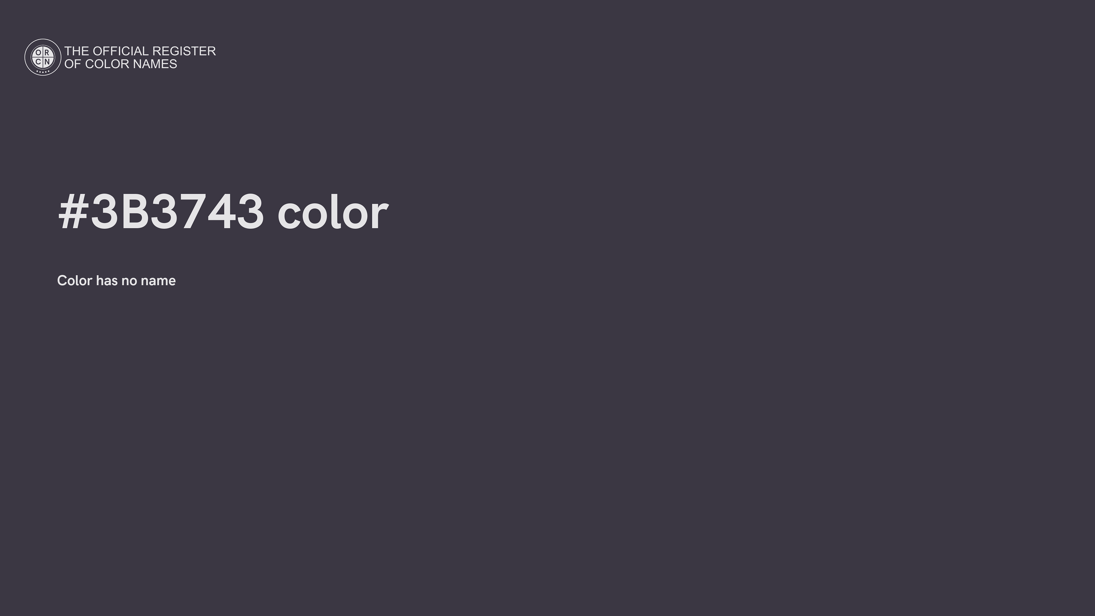 For printing in non digital world, #3B3743 is represented in CMYK as 3 Cyan, 5 Magenta, 0 Yellow, and 74 Black (Key) (C:3 M:5 Y:0 K:74).